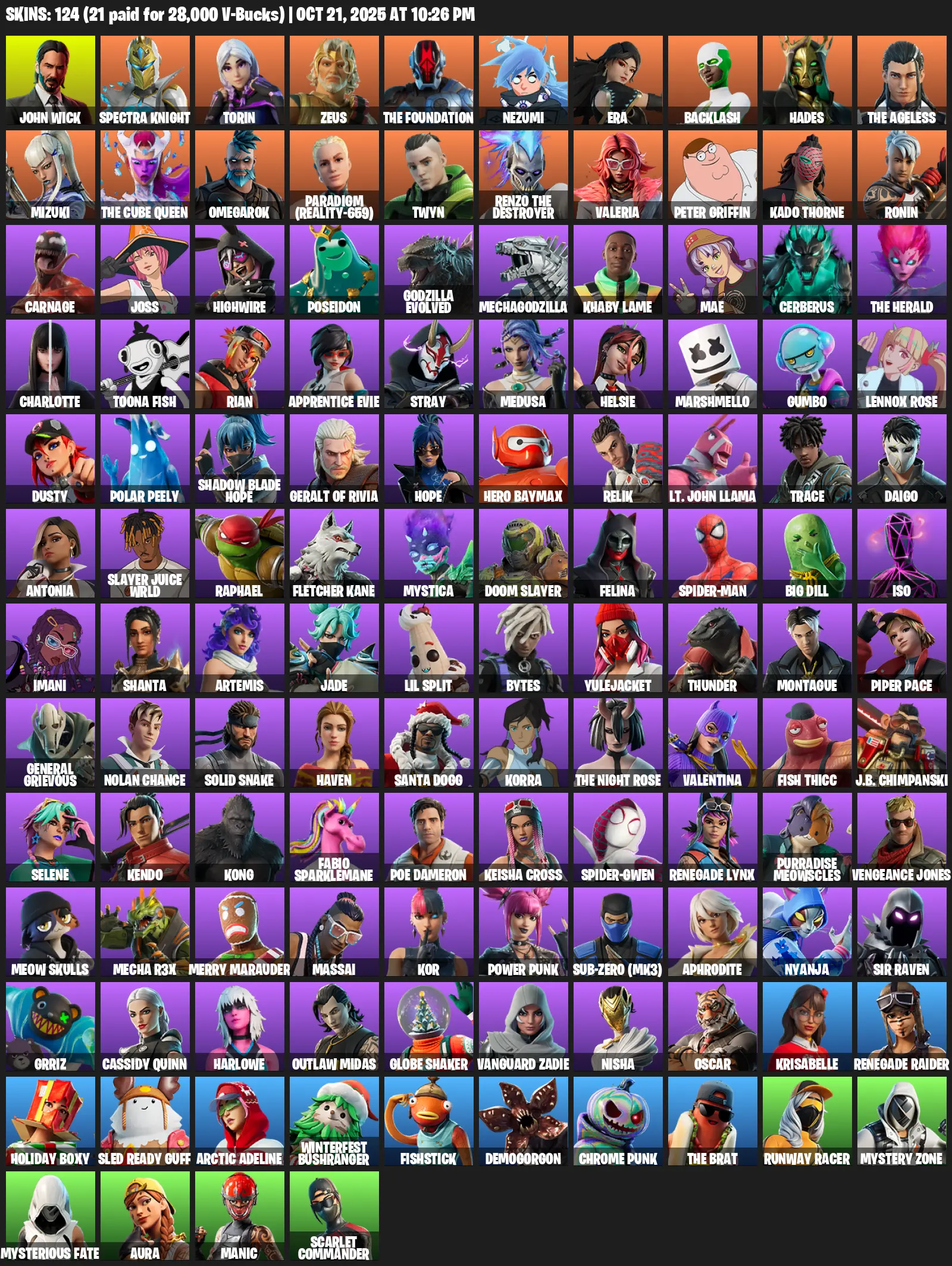 [PC/XBOX/PSN] 124 Skins | John Wick | Spectra Knight | Torin | Zeus | The Foundation | Nezumi | Era | Backlash | Hades | The Ageless | Mizuki | The Cube Queen | Omegarok | Paradigm (Reality-659) | Twyn | Renzo the Destroyer | Valeria | Peter Griffin