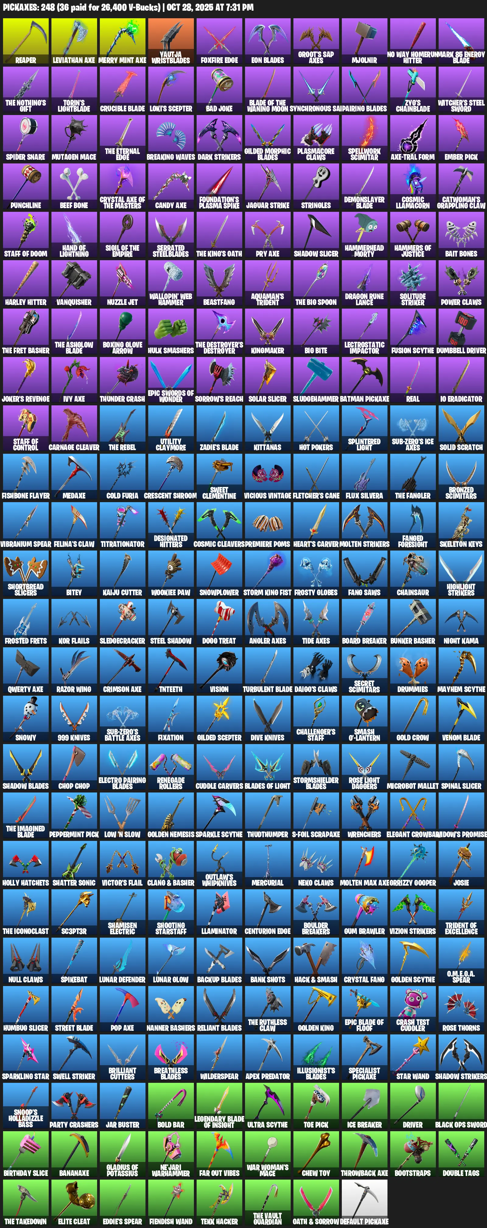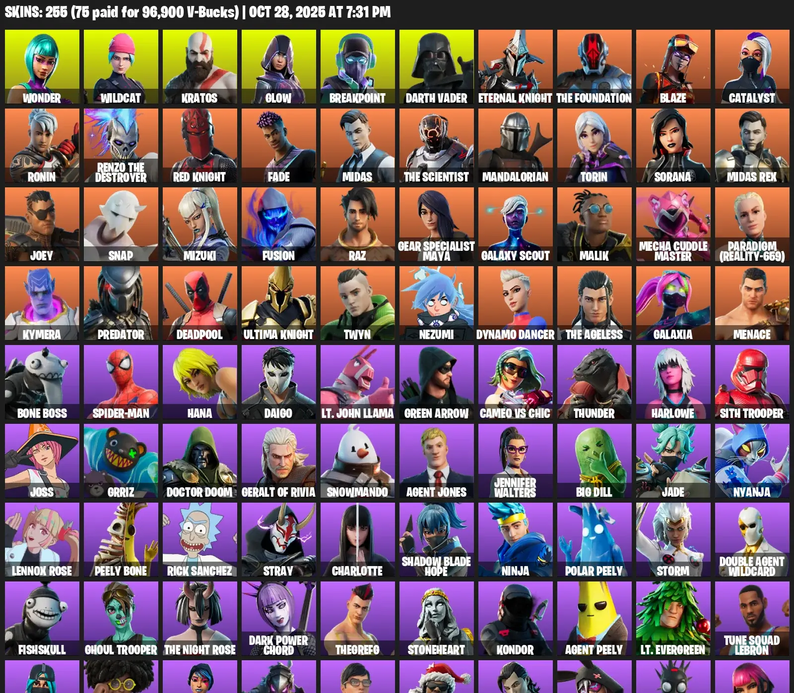 [PC/XBOX/PSN] 255 Skins | Wonder | Wildcat | Kratos | Glow | Breakpoint | Darth Vader | Eternal Knight | The Foundation | Blaze | Catalyst | Ronin | Renzo the Destroyer | Red Knight | Fade | Midas | The Scientist | Mandalorian | Torin | Sorana | Midas Rex