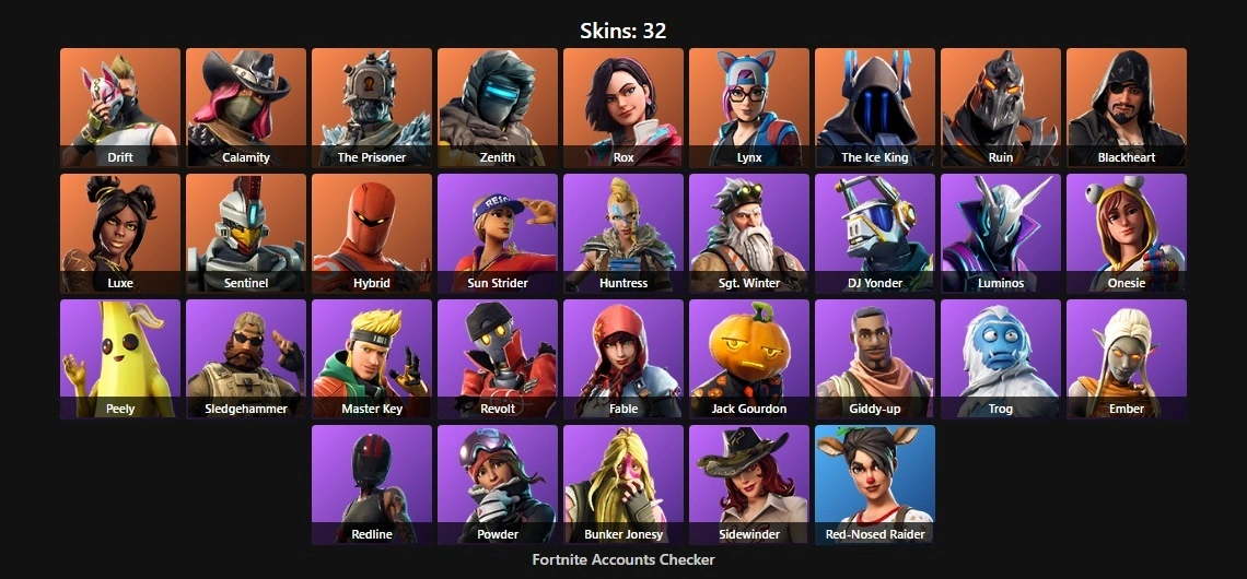PC/XBOX/PSN 32 Skins⚡ | Peely | Drift | Calamity | The Prisoner | Zenith | Rox | Lynx | The Ice King | Ruin | Blackheart | Luxe | Sentinel | Hybrid