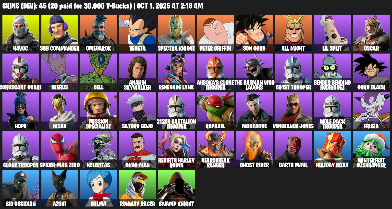PC/XBOX/PSN 45 Skins⚡ | Havoc | Sub Commander | Omegarok | Vegeta | Spectra Knight | Peter Griffin | Son Goku | All Might | Lil Split | Oscar