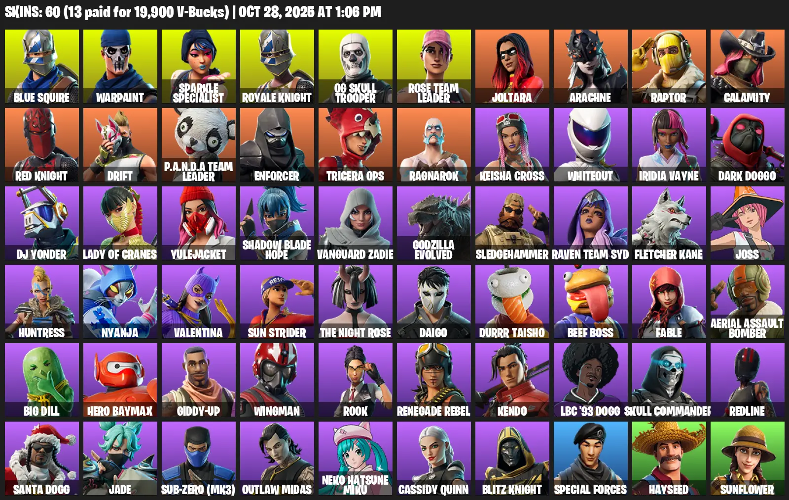 [PC/XBOX/PSN] 60 Skins | Blue Squire | Warpaint | Sparkle Specialist | Royale Knight | OG Skull Trooper | Rose Team Leader | Joltara | Arachne | Raptor | Calamity | Red Knight | Drift | P.A.N.D.A Team Leader | Enforcer | Tricera Ops | Ragnarok