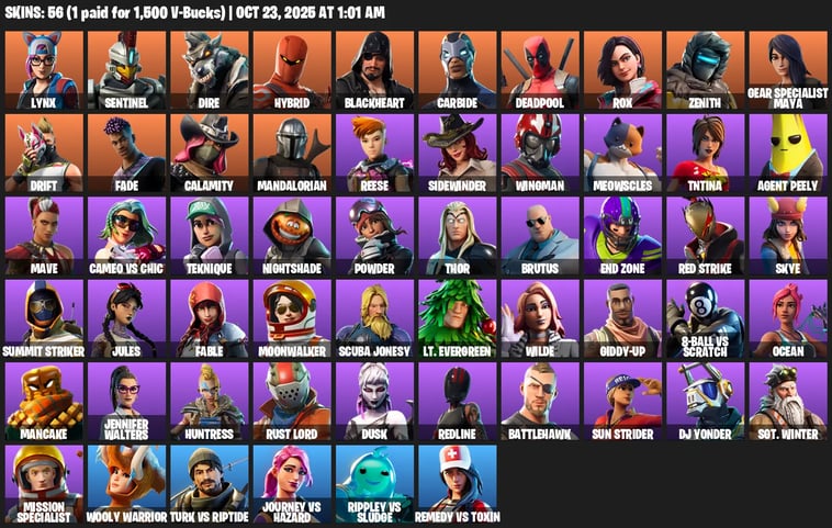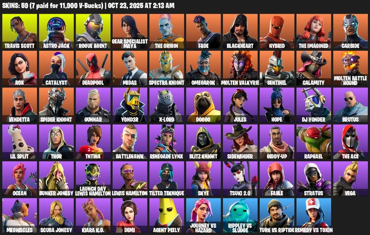 [PSN/XBOX/PC] 82 Skins | Cloud Striker | Warpaint | Astro Jack | Travis Scott | Sultura | Rose Team Leader | Fixer | Calamity | Carbide | A.I.M. | The Scientist | Lynx | Molten Battle Hound | Mandalorian | Rox | Zenith | Hybrid | Ultima Knight | Menace