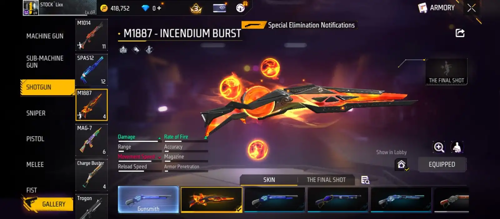 V30|LVL69|417COSTUME(21MYTHIC)|479WEAPON(1EVO+77MYTHIC)|CINDEREDCOLOSSUS-THOMPSONLVL3|INCENDIUMBURST-M1887|APOCALYPTICRED-M1014