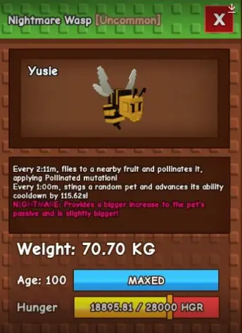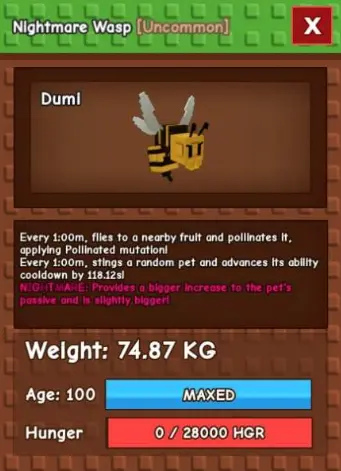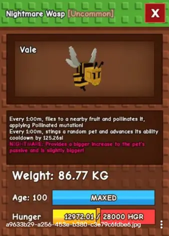 Αγορά Τώρα Semi Titanic Nightmare Wasp 70-71 kg cd : 60s (cooldown other pets by 115s) - Grow A Garden