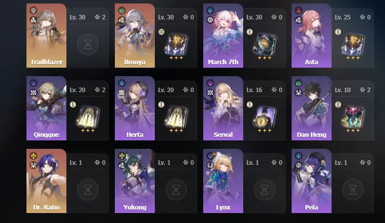 🌍 NA Server | 🎯 TL 16 | 🌟 12 Characters + 2 Legendaries | 💫 Bronya, Trailblazer | 🔹 March 7th, Asta, Qingque, Herta, Serval, Dan Heng, Dr. Ratio, Yukong, Lynx, Pela