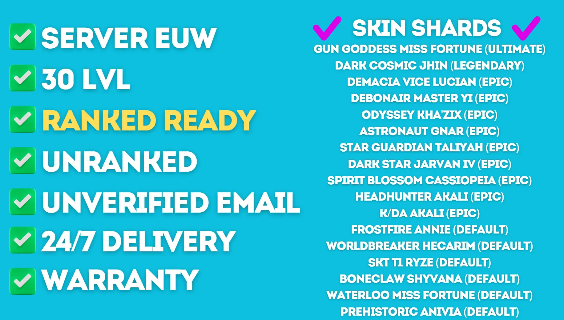 EUW 30 LvL ✅ Ranked Ready ✅ BE: 57235 ✅ Unverified ✅ Unranked ✅ Shards: Gun Goddess Miss Fortune, Dark Cosmic Jhin, Demacia Vice Lucian, Debonair Master Yi, Odyssey Kha'Zix, Astronaut Gnar, Star Guardian Taliyah, Dark Star Jarvan IV