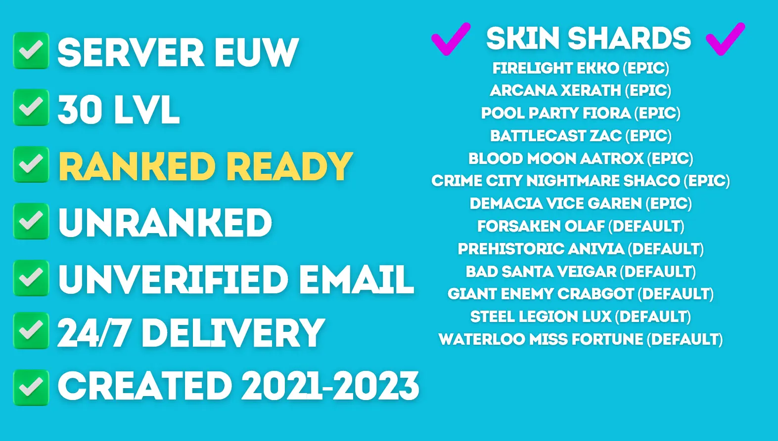 EUW 30 LvL ✅ Ranked Ready ✅ BE: 58595 ✅ Unverified ✅ Unranked ✅ Shards: Firelight Ekko, Arcana Xerath, Pool Party Fiora, Battlecast Zac, Blood Moon Aatrox, Crime City Nightmare Shaco, Demacia Vice Garen, Forsaken Olaf, Prehistoric Anivia, Bad Santa Veigar