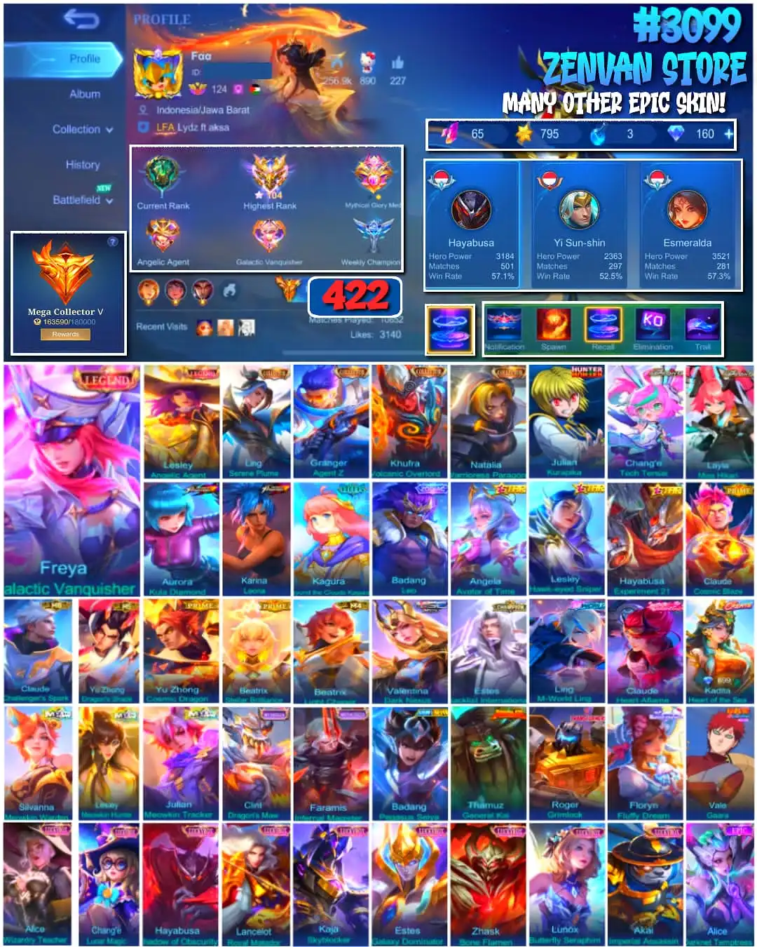 #3099 🔥 422 Skins 🔥 Legend Freya & Lesley 🔥 Collector Ling, Granger, Kufra & Natalia 🔥 Kurapika 🔥 Aspirant Change & Layla 🔥 Clouds Kagura 🔥 Prime Claude & Beatrix 🔥 Transformers Roger 🔥 KoF Karina, Aurora 🔥 Many Limited 🔥 Many Epic 🔥 Safe Account ✅