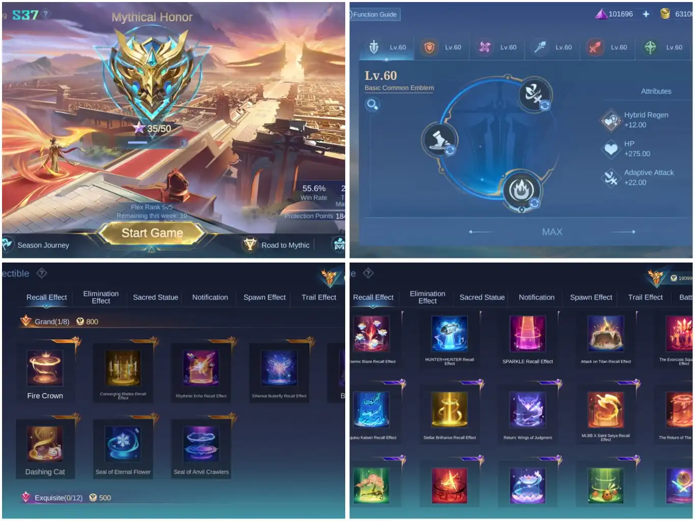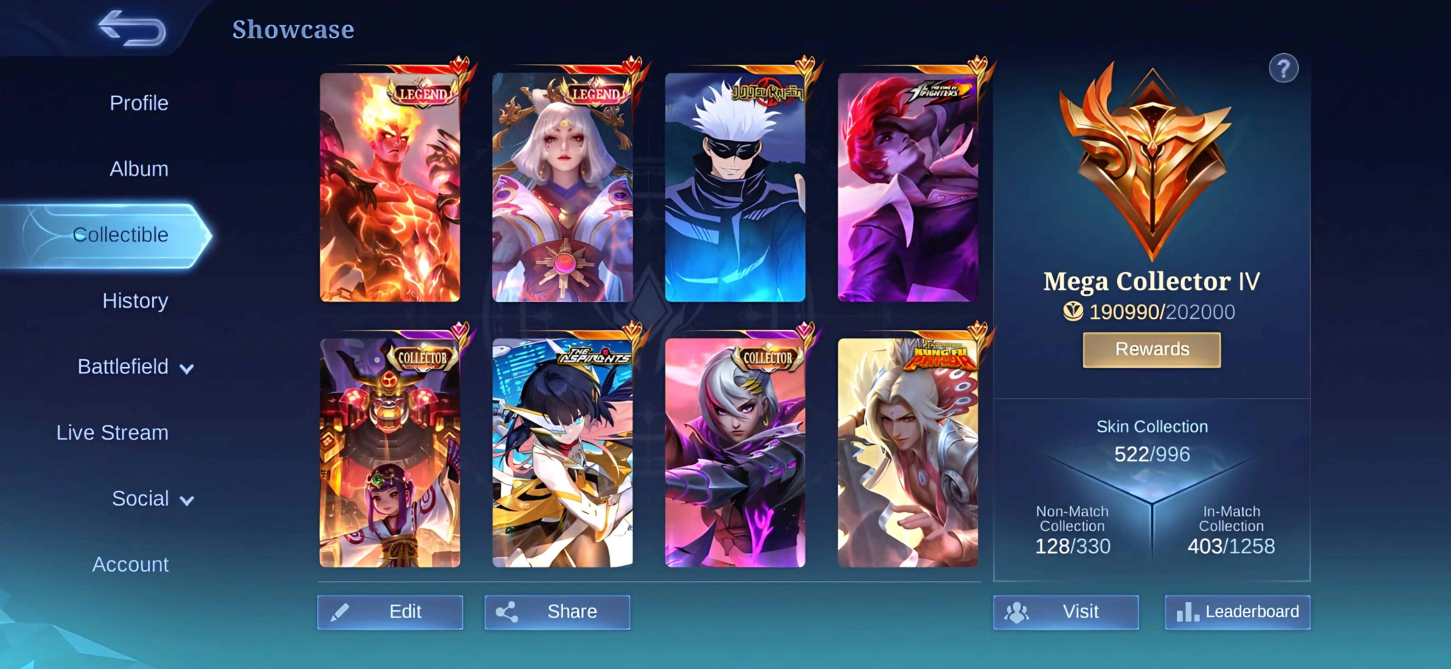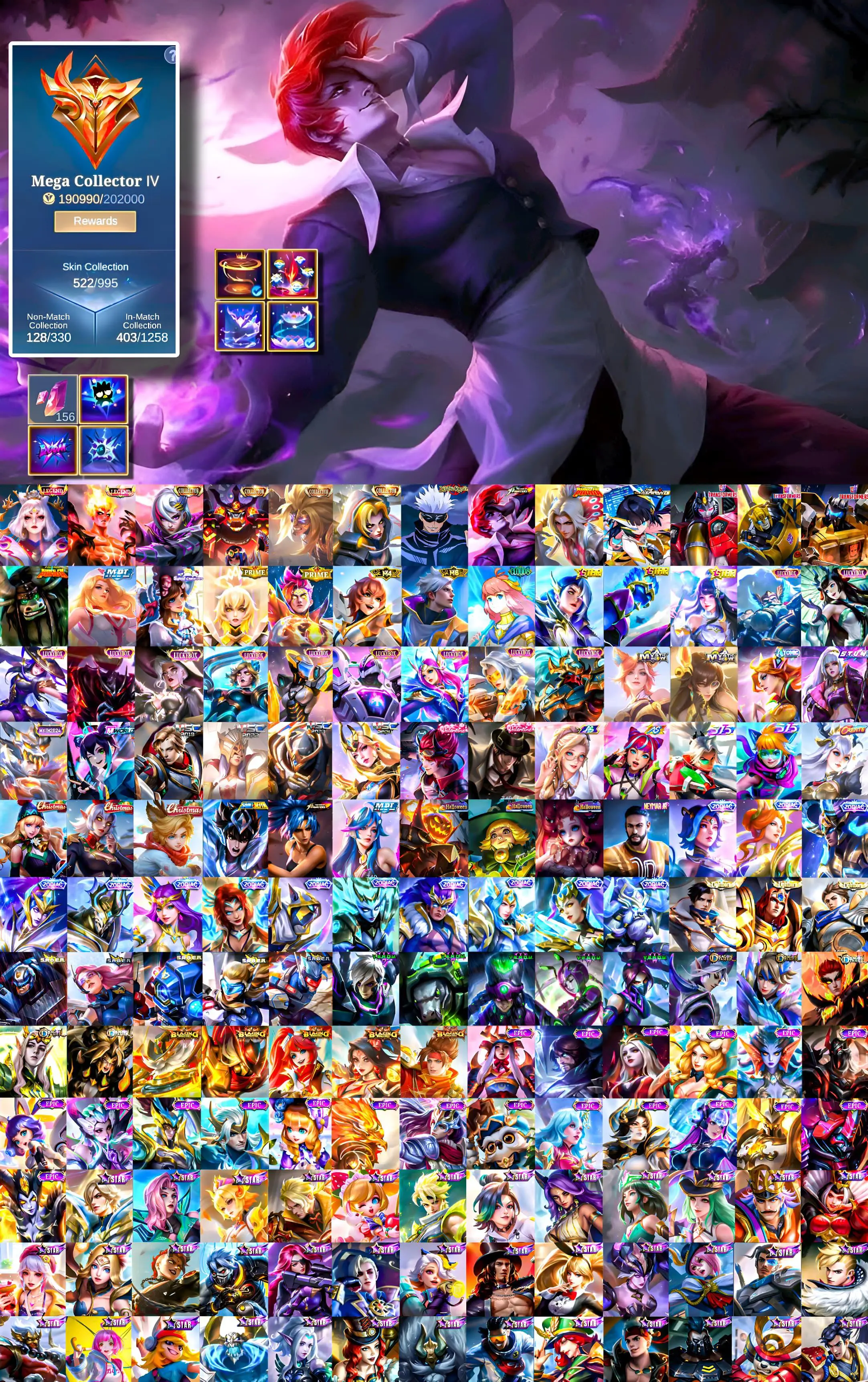 [IOS/ANDROID] CEL LVL 77 | 129 HEROES | 522 SKINS | MEGA 4 | 2 LEGEND VALIR LUNOX ⸱ 4 COLLECTOR ⸱ GOJO JJK ⸱ CHOU KOF ⸱ LING LORD SHEN ⸱ MPL RAFAELA