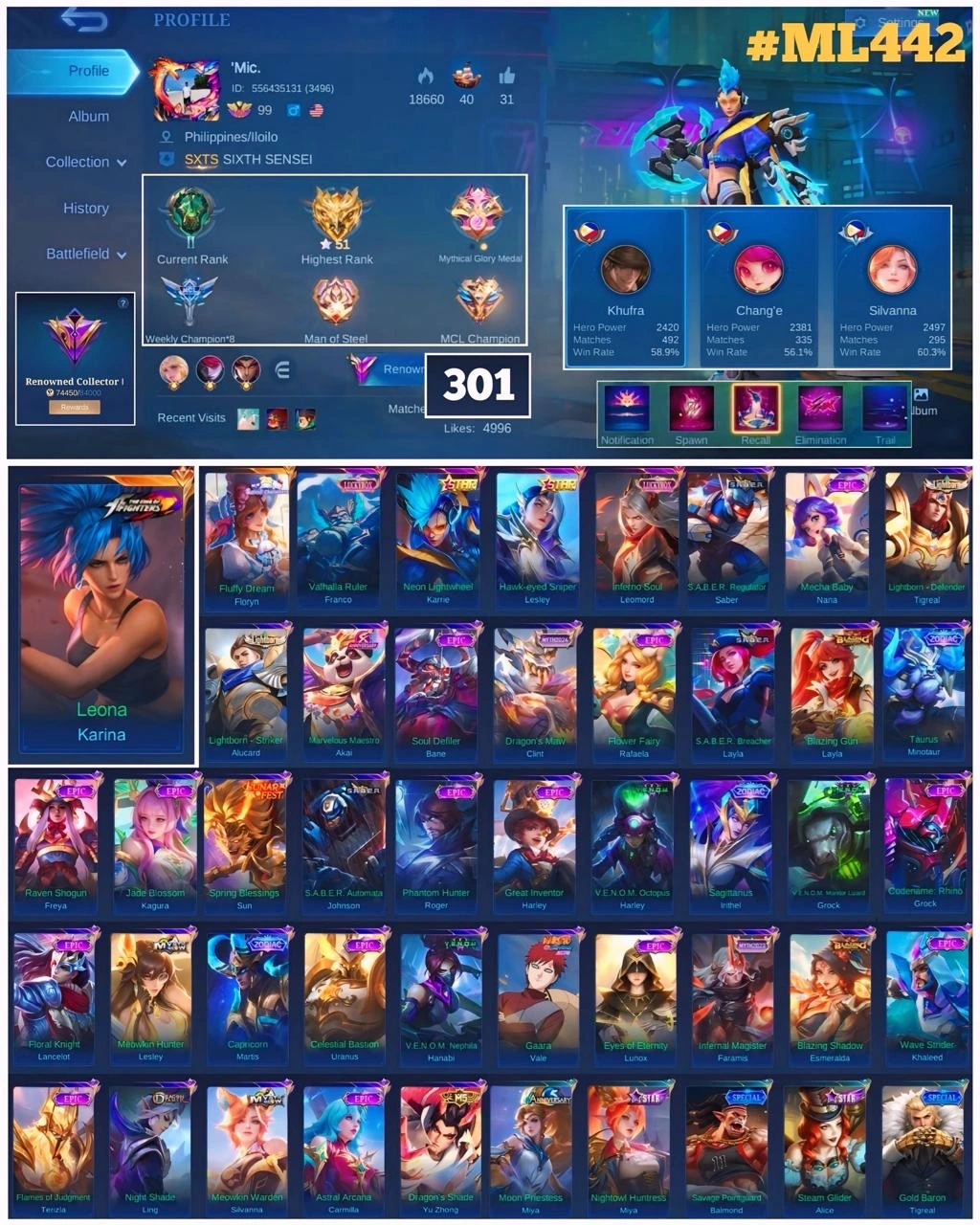 ML 442⚡Full max emblem⚡️Skins 301⚡️Hero 130⚡️Kof Karina⚡️Sanrio Floryn⚡️Luckybox Franco Leomord⚡️Star Karrie Lesley⚡️Saber⚡️Lightborn Tigreal Alucard⚡️14 Epic⚡️Myth Clint⚡️Blazing Layla⚡️Zodiac Minotaur Irithel⚡️Lunarfest Sun⚡️Venom Harley Grock