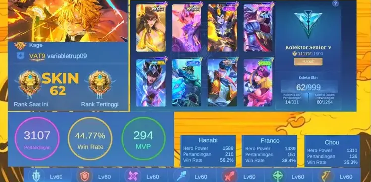 ML263 62 skins and holds the Kolektor Senior V title. Notable hero usage is for Hanabi , Franco , and Chou (G)