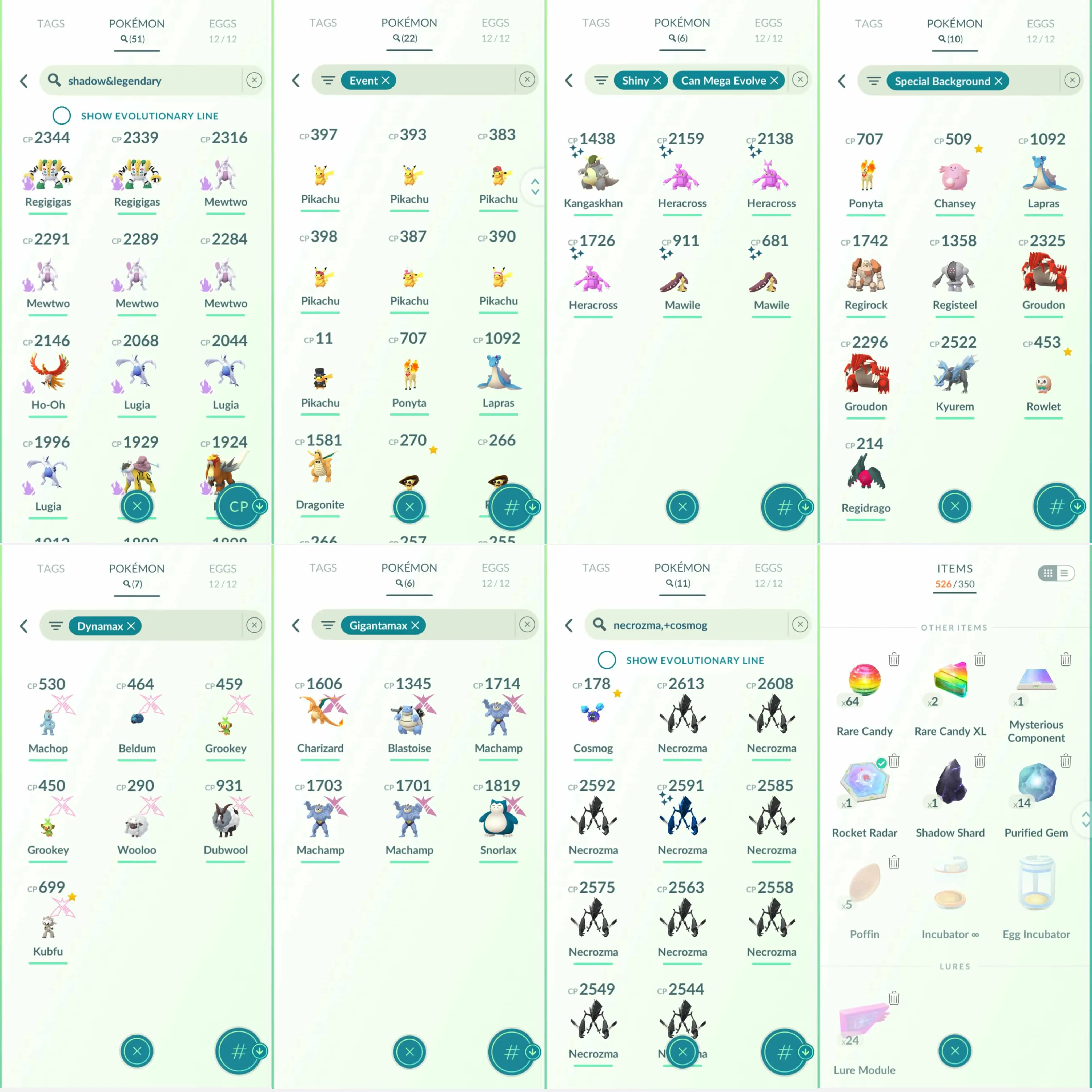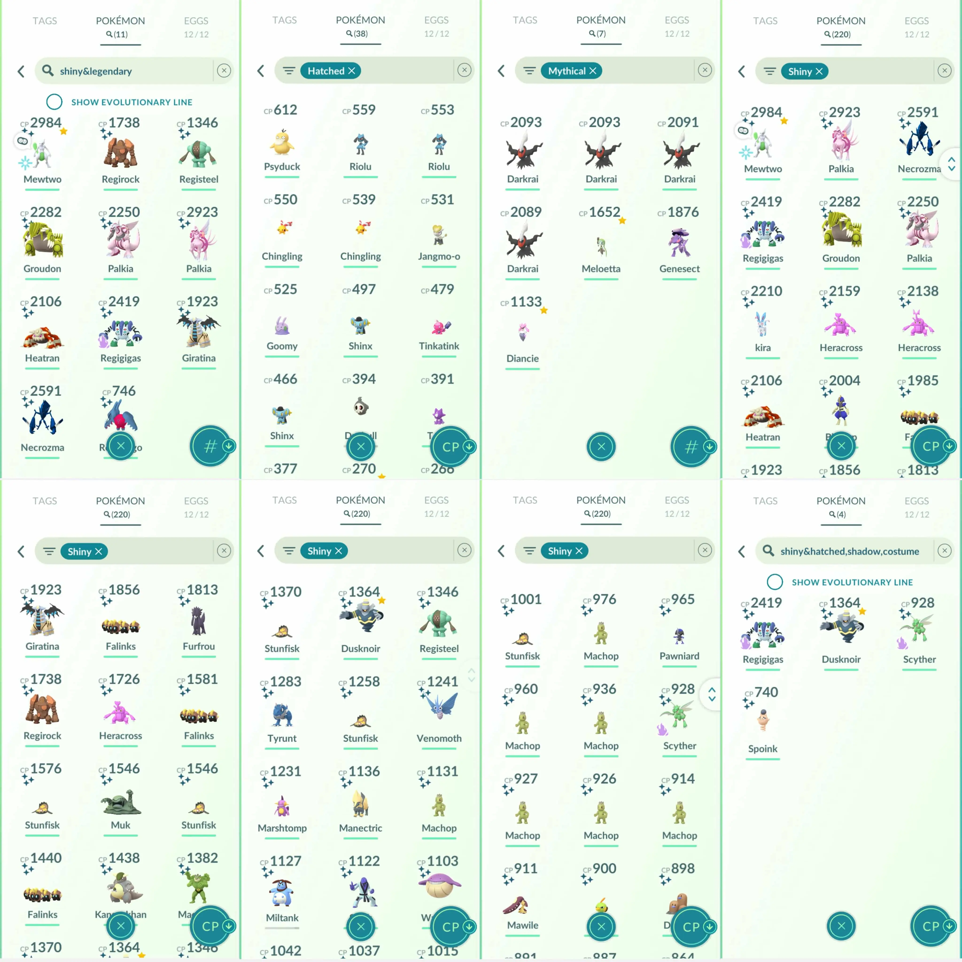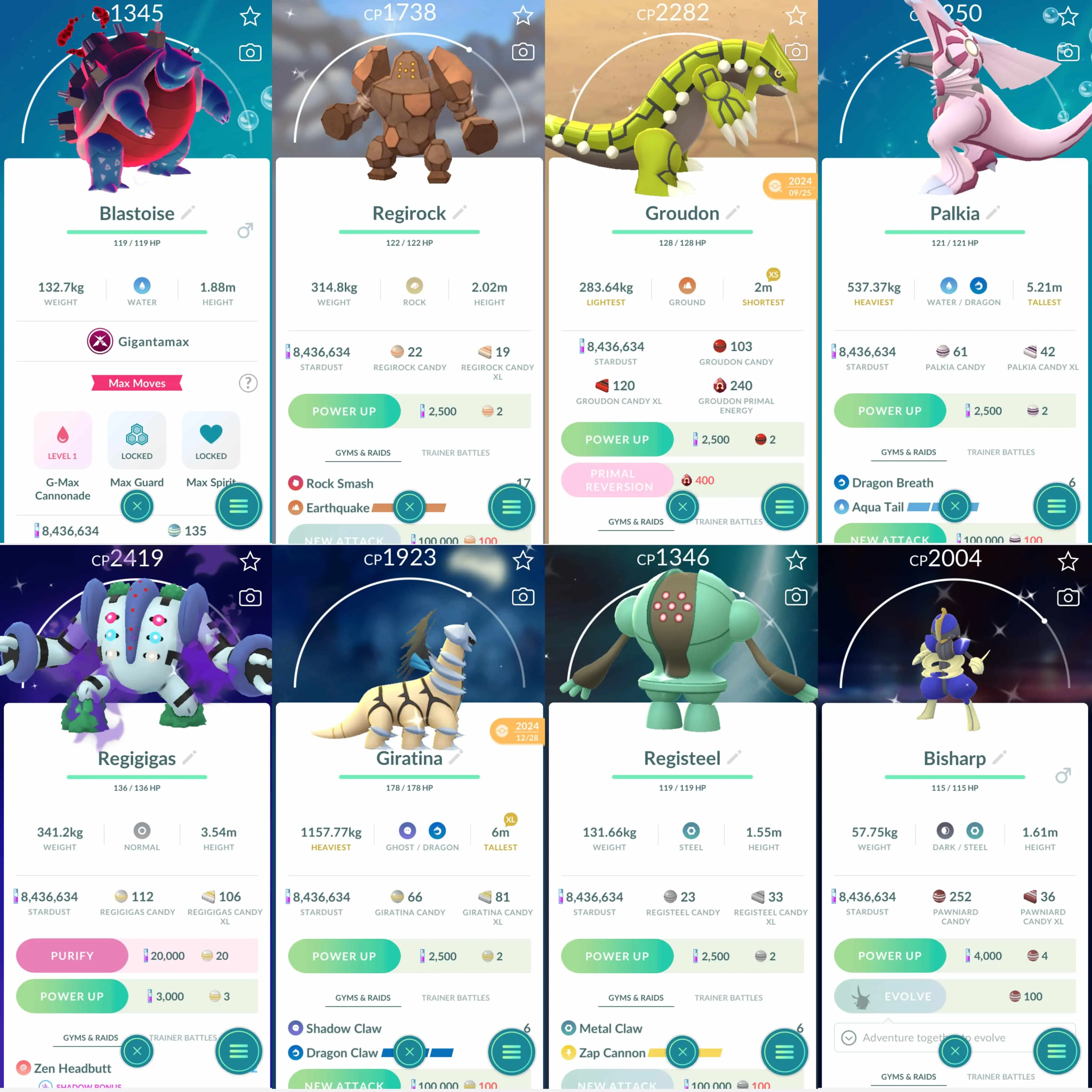 Shiny: Regidrago, Palkia Origin, Necrozma, Shadow Regigigas, Giratina, Palkia, Regirock, Registeel, Groudon, Heatran, sylveon, falinks, furfrou, tyrunt, wailmer, pawniard