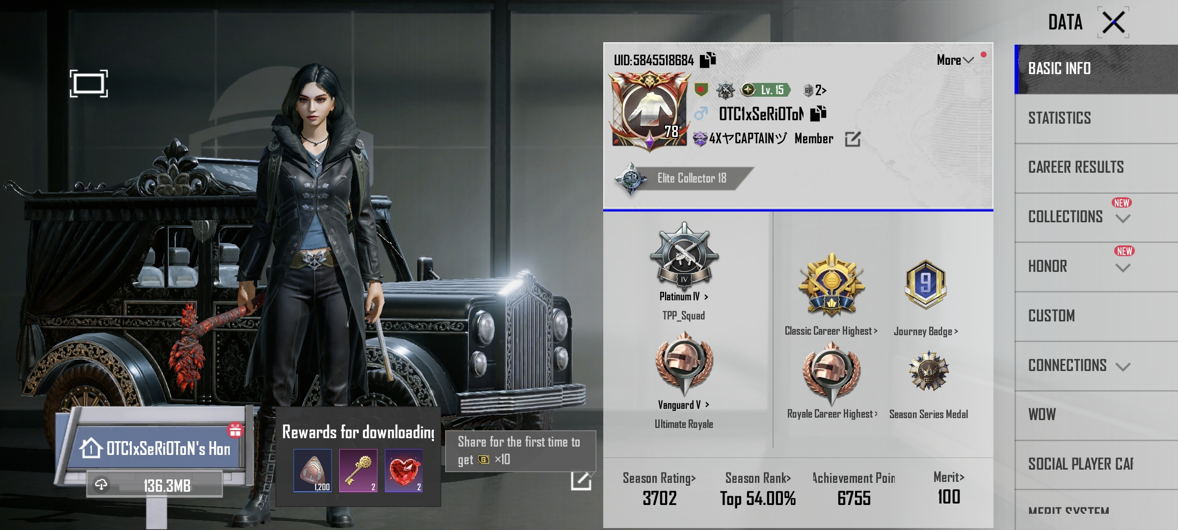 Account level 78(very high) | 23 gub lab (6 elimination broadcast) | Collection Level 58 | 1x Mythic glider | Pharaoh's Scarab parachute