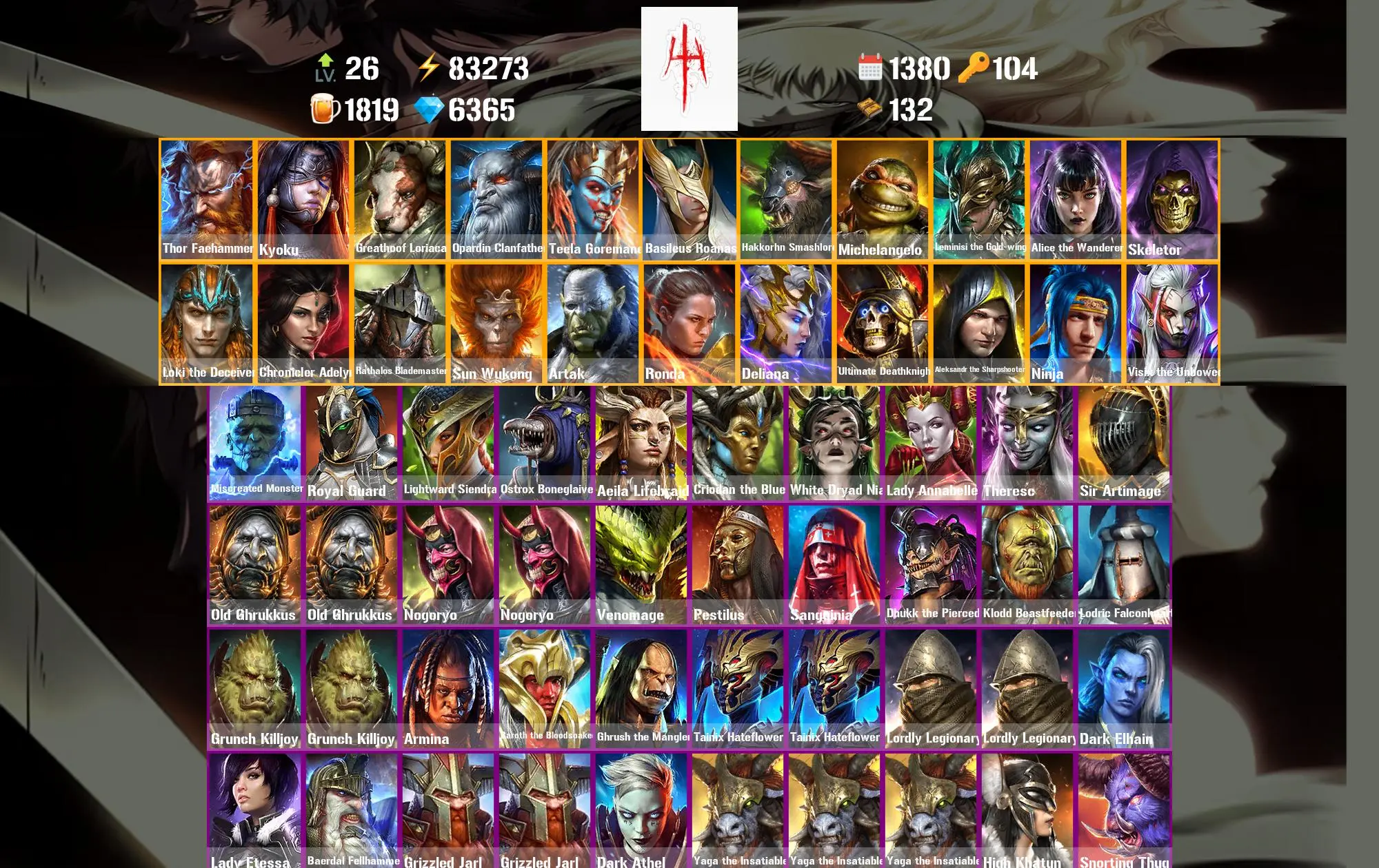 1380 Days 83.3k Energy Thor Faehammer ⸱ Kyoku ⸱ Greathoof Loriaca ⸱ Opardin Clanfather ⸱ Teela Goremane ⸱ Miscreated Monster ⸱ Royal Guard ⸱ 55.7m Silver ⸱ 6.4k Gems