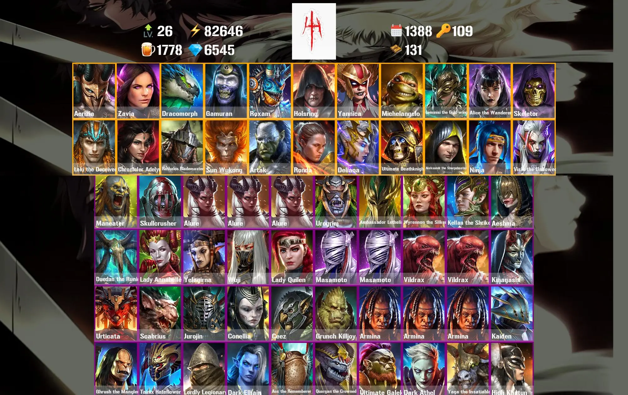 1388 Days 82.6k Energy Acrizia ⸱ Zavia ⸱ Dracomorph ⸱ Gamuran ⸱ Roxam ⸱ Maneater ⸱ Skullcrusher ⸱ 54.2m Silver ⸱ 6.5k Gems