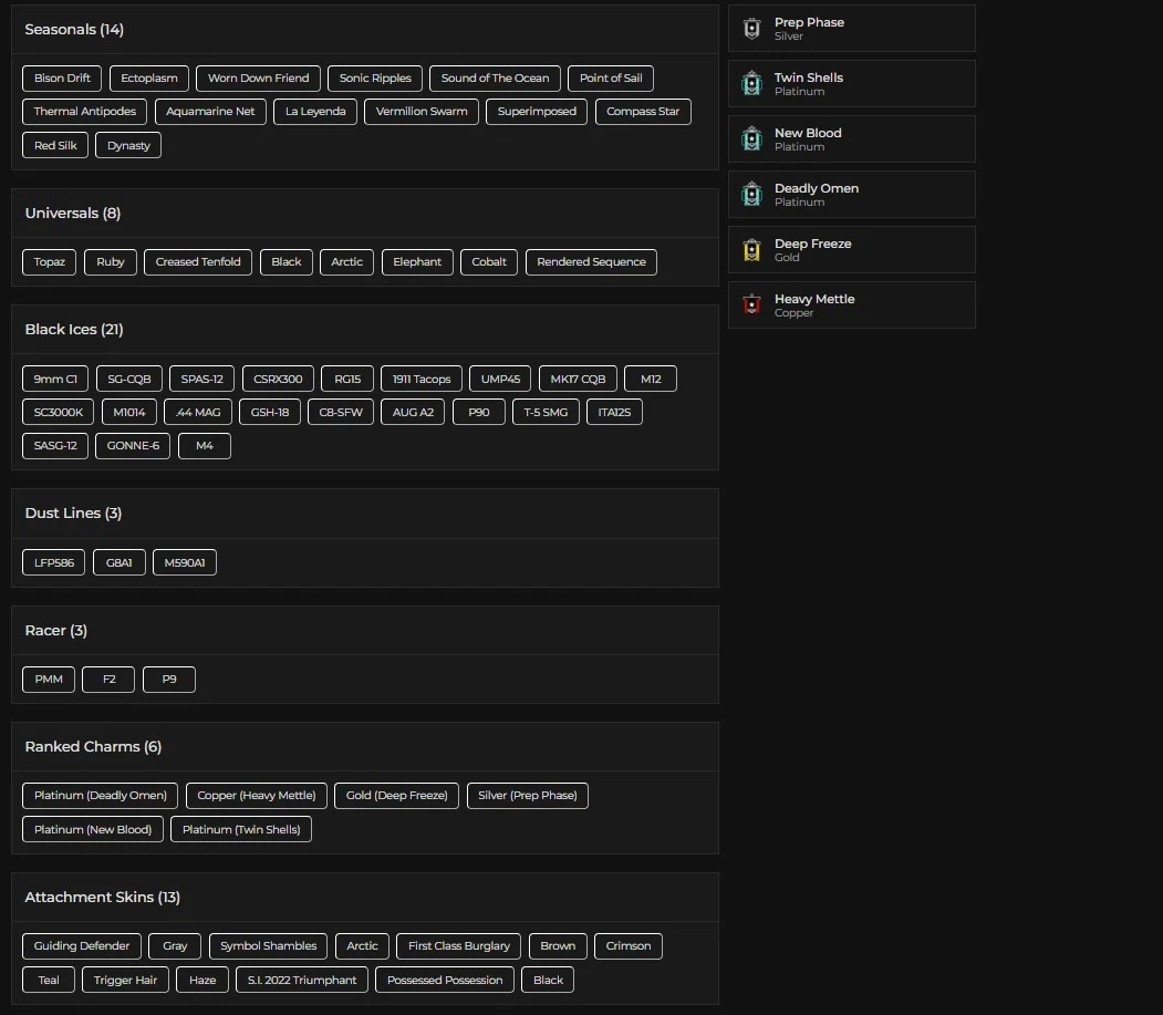 204 LVL ⸱ 21X BLACK ICES ⸱ 3X RACER ⸱ 14X SEASONALS ⸱ 8X UNIVERSALS ⸱ 7X ELITES ⸱ 3X PLATINUM ⸱ 53 OPERATORS ⸱ 189K RENOWN ⸱ FA