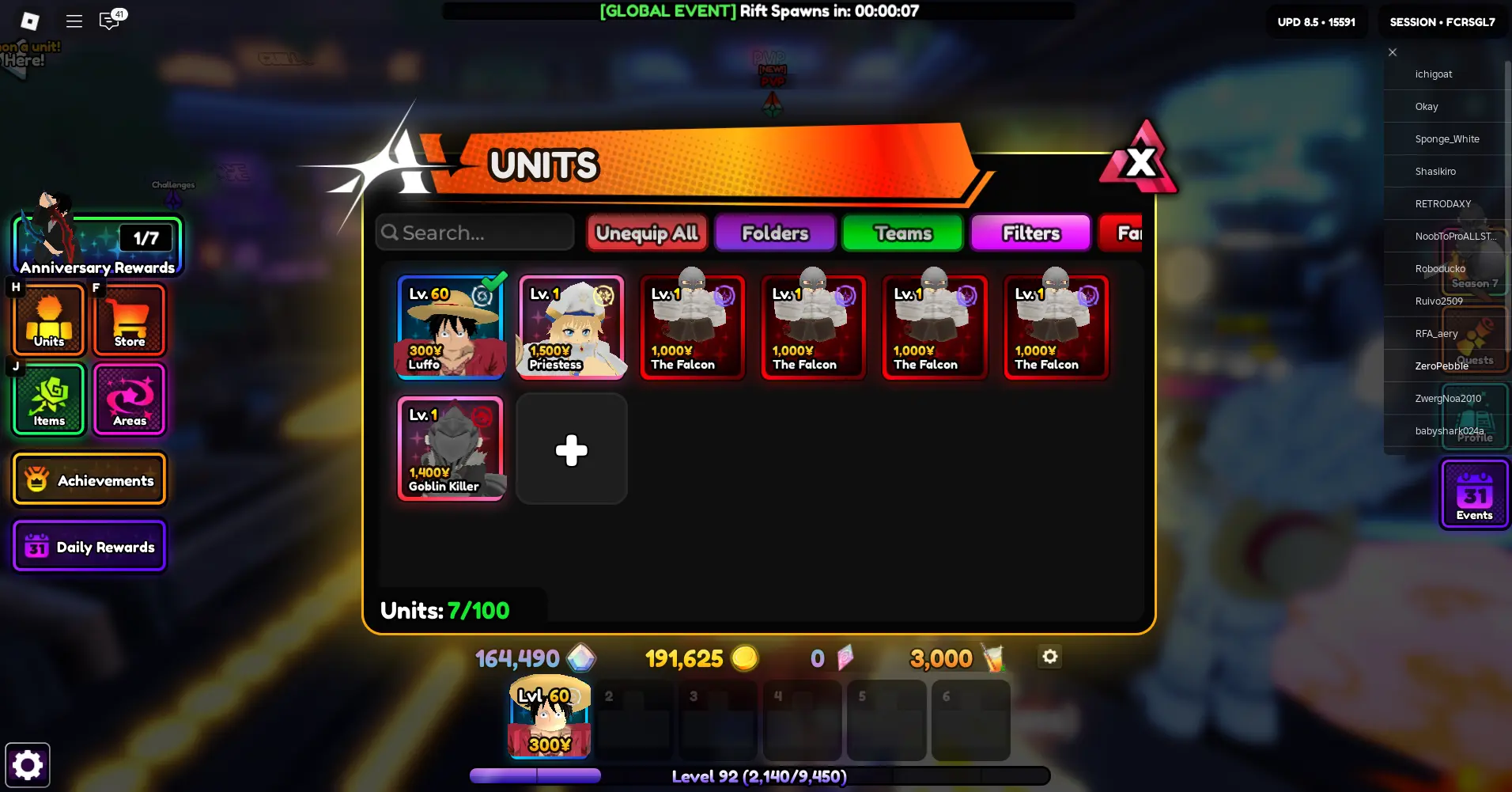 Anime Vanguards ⸱ 92LV ⸱ 164K Gems ⸱ 232Trait Rolls ⸱ The Falcon ⸱ Priestess ⸱ Goblin Killer INSTANT DELIVERY