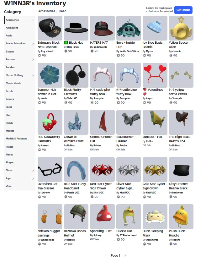 RBL2263 W1NN3R's Inventory: Black Hat, Sideways NYC Cap, HATERS HAT, Envy, Yellow Space Alien, Crown of Winter’s Frost, Blaze Burner Helmet, Red/Gold/Silver Star Cyber Crowns, Duckie Hat, Plush Duck Hoodie, more (G)