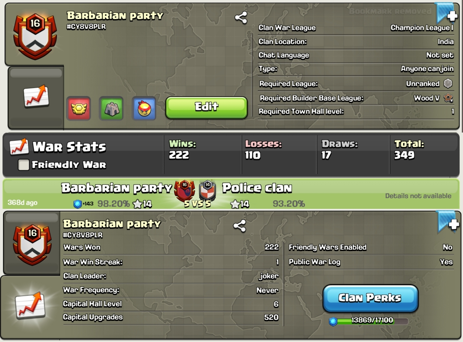 [ LEVEL 17 ] 🥶 BOSS ARMY 🥶 CHAMPION 1 🔥 CAPITAL 10 MAX 🥵 WAR LOG POSITIVE 💀 J05