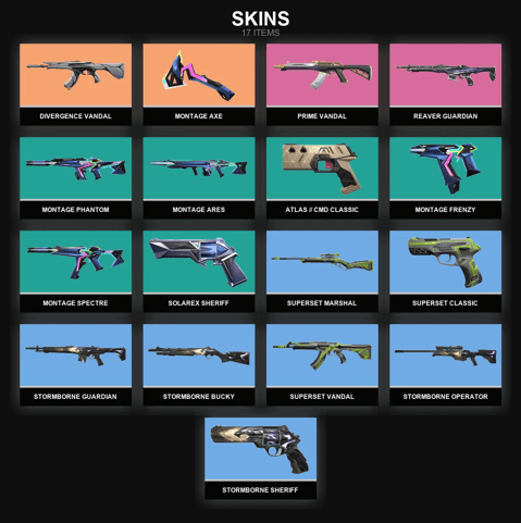 EU | 17 skins 🐓 Divergence Vandal 🐓 Prime Vandal 🐓 Montage Axe 🐓 Reaver Guardian 🐓 Montage Phantom 🐓 Montage Ares 🐓 ATLAS // CMD Classic 🐓 Montage Frenzy 🐓 Montage Spectre 🐓 Solarex Sheriff 🐓 Superset Marshal 🐓 Superset Classic 🐓 F4760