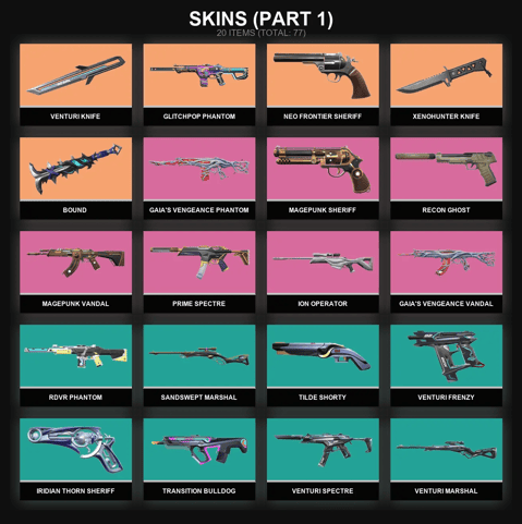 AP | 27 skins 🐓 Magepunk Sparkswitch 🐓 ChronoVoid Vandal 🐓 Prime Vandal 🐓 Iridian Thorn Blade 🐓 Protocol 781-A Spectre 🐓 Recon Phantom 🐓 Reaver Operator 🐓 Transition Shorty 🐓 Iridian Thorn Operator 🐓 Y2121