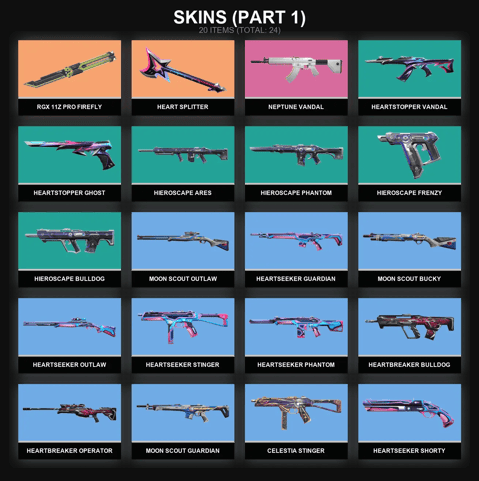 EU | 24 skins 🐓 RGX 11z Pro Firefly 🐓 Heart Splitter 🐓 Neptune Vandal 🐓 Heartstopper Vandal 🐓 Heartstopper Ghost 🐓 Hieroscape Ares 🐓 Hieroscape Phantom 🐓 Hieroscape Frenzy 🐓 Hieroscape Bulldog 🐓 Moon Scout Outlaw 🐓 Heartseeker Guardian 🐓 L6869