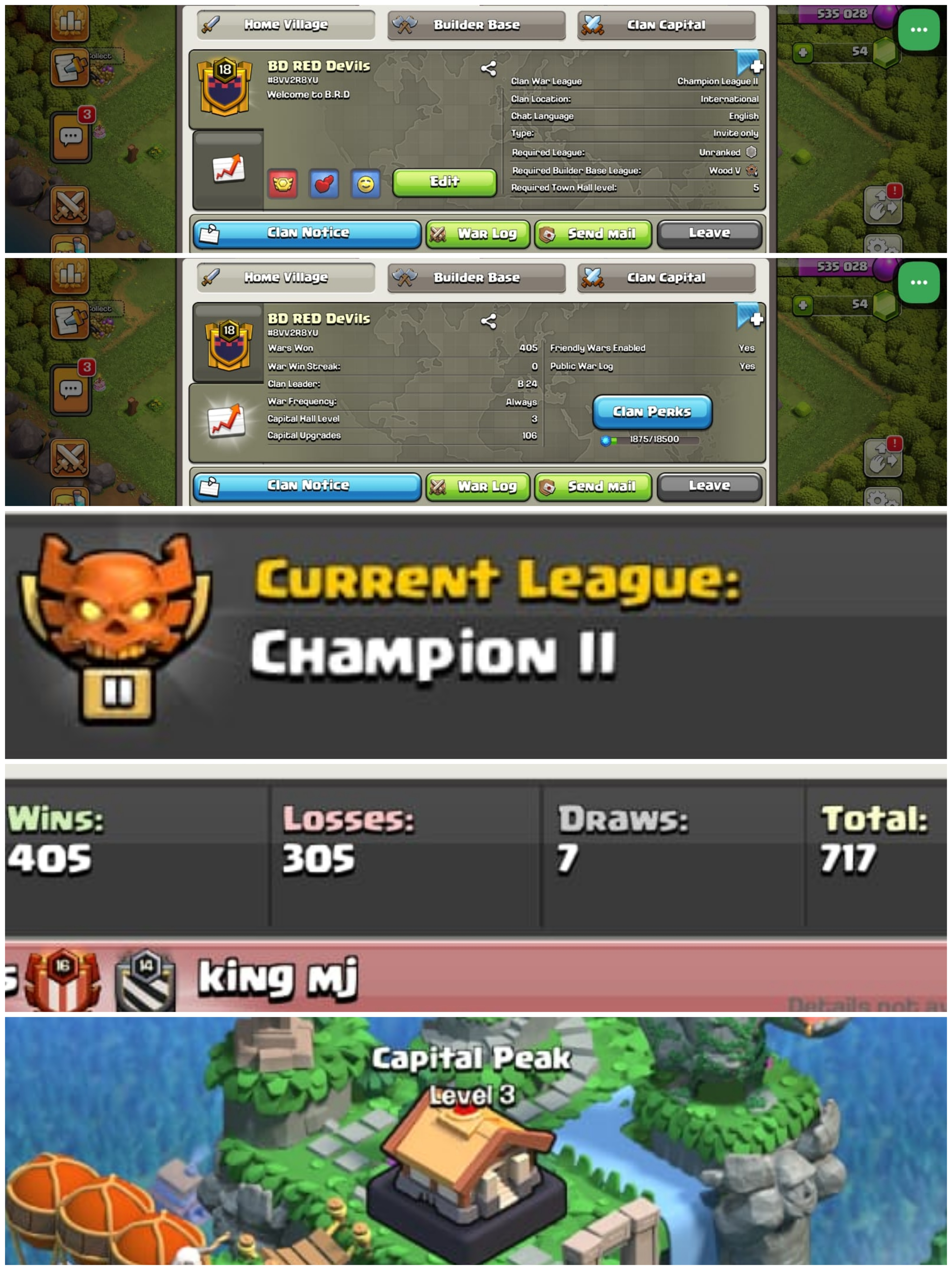 SUPER RARE ➤CLAN LEVEL 18 ➤ CHAMPION LEAGUE 1 ➤NAME: Bd red devil's ➤ RARE NAME ➤ CLAN CAPITAL 3 || WIN- 405 | LOSS- 305 ➤LOW PRICE