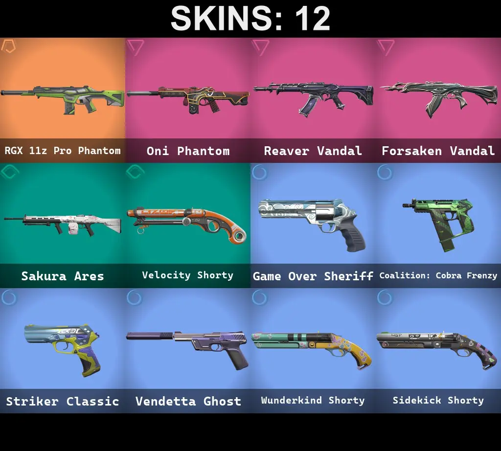 ❤️ 12 SKINS ❤️ RGX 11Z PRO PHANTOM ❤️ REAVER VANDAL ❤️ FORSAKEN VANDAL ❤️ ONI PHANTOM ❤️ SAKURA ARES ❤️ VELOCITY SHORTY ❤️ GAME OVER SHERIFF ❤️ STRIKER CLASSIC ❤️ VENDETTA GHOST ❤️ WUNDERKIND SHORTY ❤️ SIDEKICK SHORTY