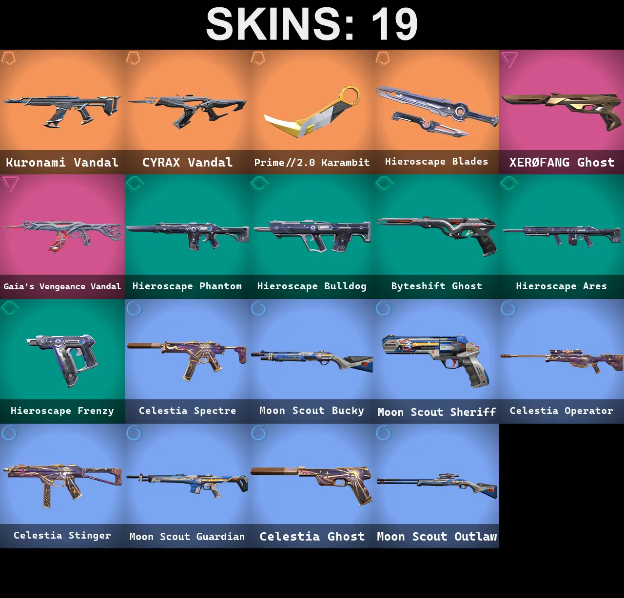 19 SKINS | 2 KNIFE | KURONAMI VANDAL | XEROFANG GHOST | PRIME//2.0 KARAMBIT | CYRAX VANDAL | HIEROSCAPE BLADES | GAIA'S VENGEANCE VANDAL | HIEROSCAPE PHANTOM | HIEROSCAPE BULLDOG | BYTESHIFT GHOST | HIEROSCAPE ARES | HIEROSCAPE FR
