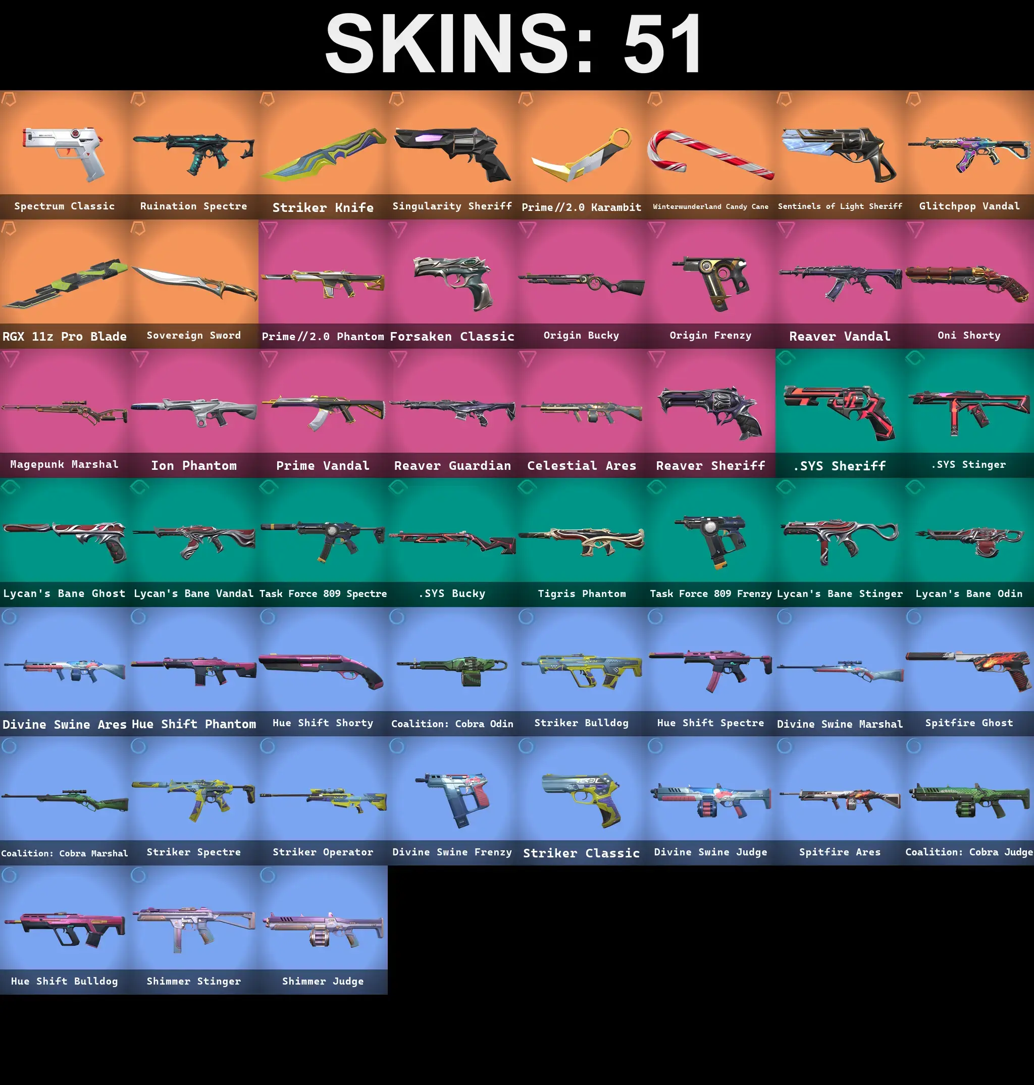 51 SKINS | 5 KNIFE | RGX 11Z PRO BLADE | RUINATION SPECTRE | GLITCHPOP VANDAL | MAGEPUNK MARSHAL | REAVER VANDAL | REAVER SHERIFF | REAVER GUARDIAN | SPECTRUM CLASSIC | SOVEREIGN SWORD | PRIME//2.0 KARAMBIT | PRIME VANDAL | PRIME/