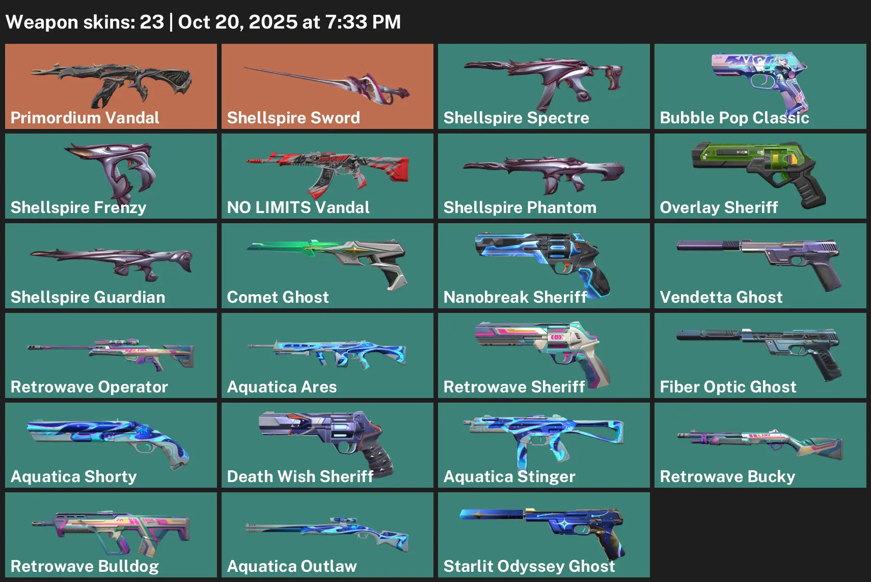 AP | 23 Skins | exp BRONZE 1 | Fiber Optic Ghost | Starlit Odyssey Ghost | Primordium Vandal | Shellspire Sword | Shellspire Spectre | S4G