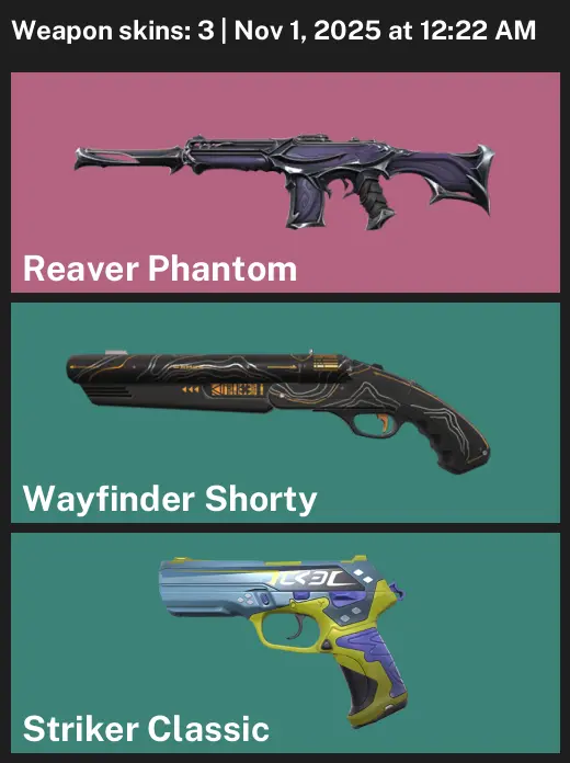 💪 AP 🪙 Unranked 🥪 3 Skins 🐠 609 VP 📻 18 Agents 🥒 Value: 1775 VP 🧄 Reaver Phantom 🐧 Wayfinder Shorty ☠️ Striker Classic