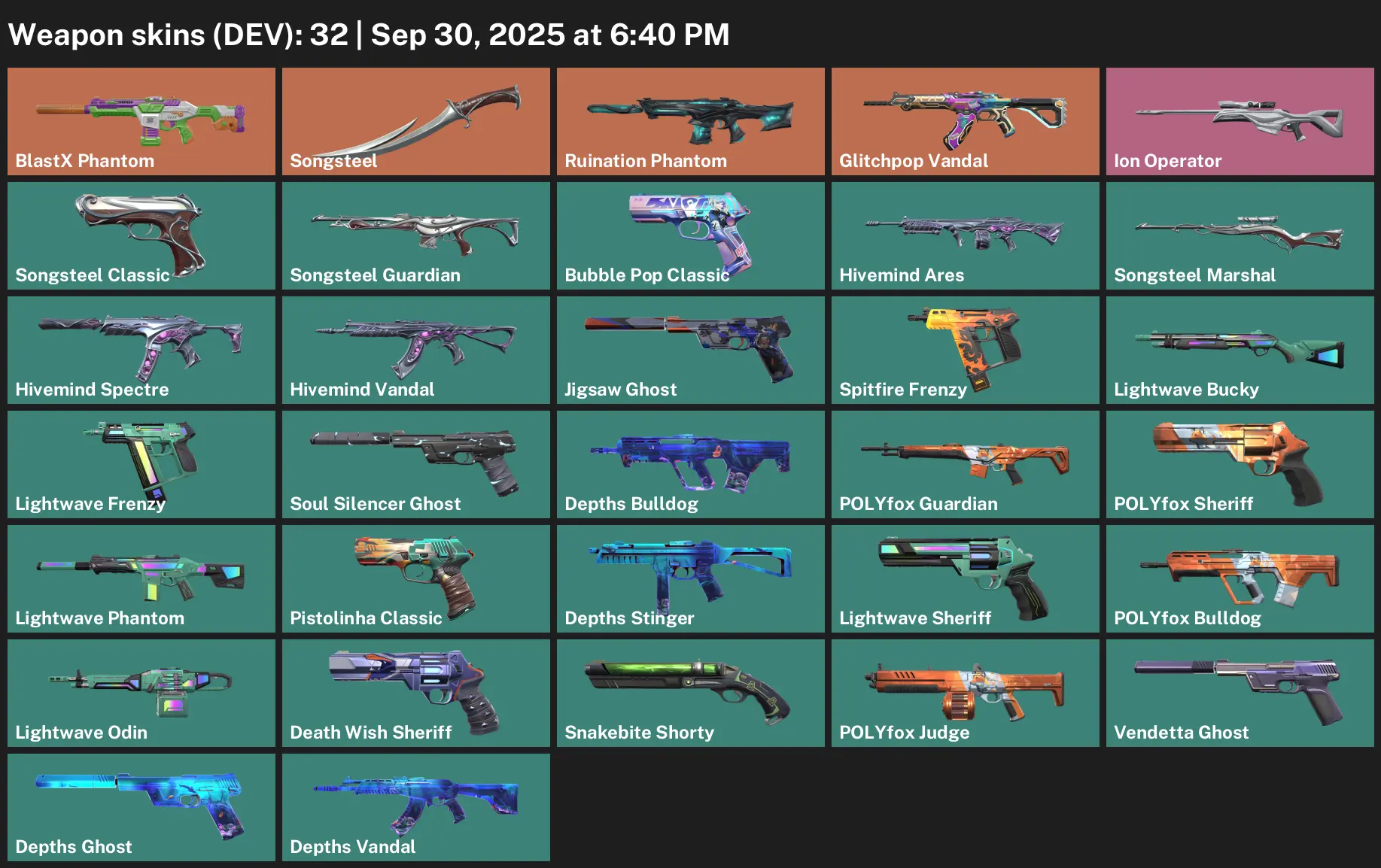 🥈 AP 🤹♂️ Unranked 🥊 32 Skins 🫶 0 VP 🕌 20 Agents 🚥 Value: 8300 VP ⛹️ BlastX Phantom 🚣 Songsteel 🎋 Ruination Phantom 🖊 Glitchpop Vandal 🛀 Ion Operator 🪜 Songsteel Classic