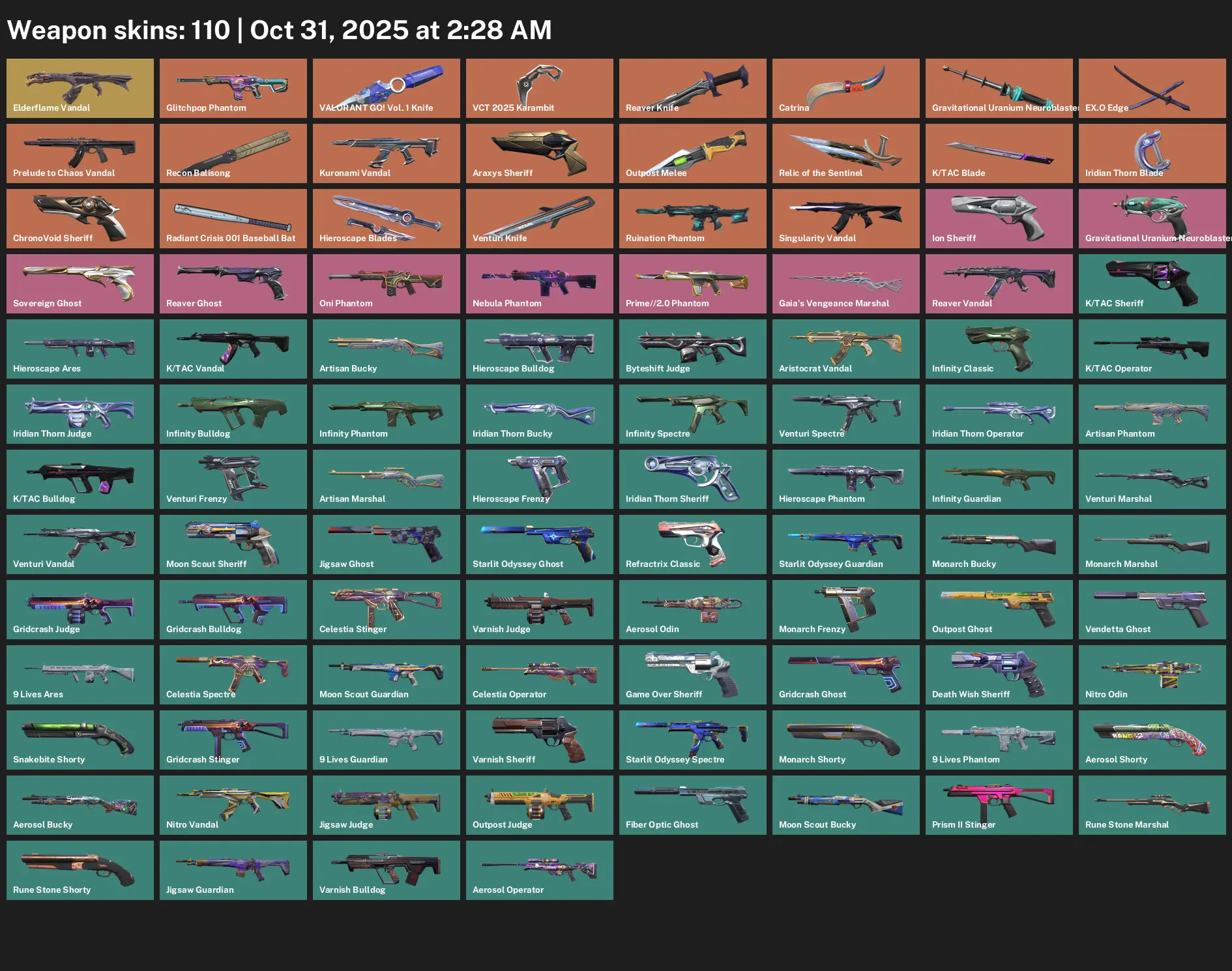 🤐 EU 👔 Unranked 🎈 110 Skins 🛢 88 VP 🥻 21 Agents 🫢 Value: 66025 VP 🖨 Elderflame Vandal 🥑 Glitchpop Phantom 🥩 VALORANT GO! Vol. 1 Knife 🐉 VCT 2025 Karambit 😧 Reaver Knife 🦗 Catrina