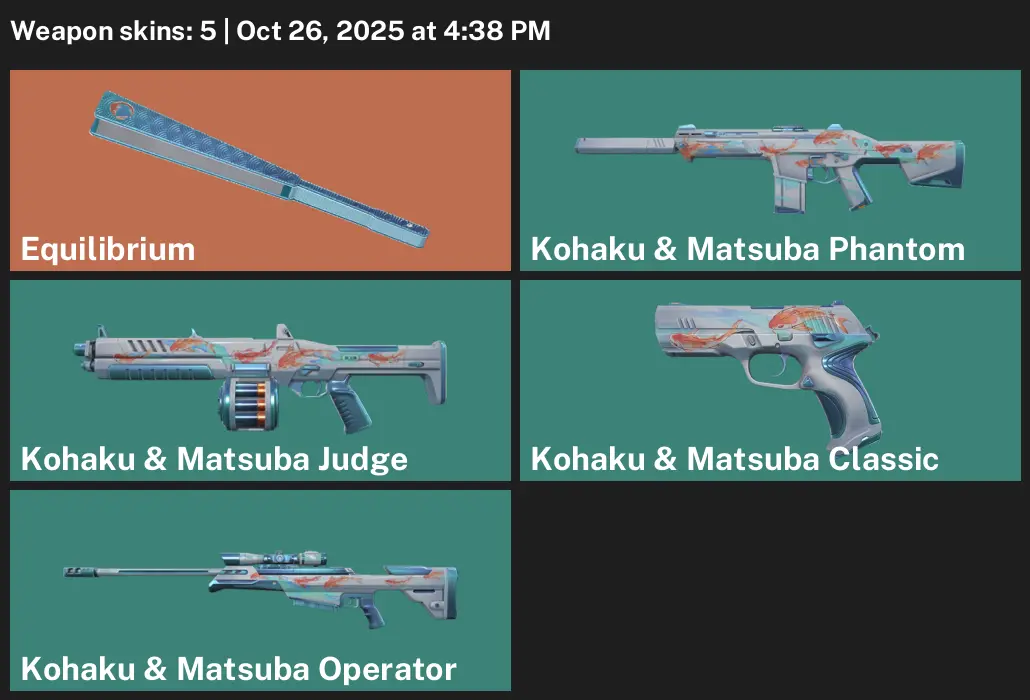 ✌️ EU 🪗 Unranked 🏦 5 Skins 👖 5640 VP 🚥 0 Agents 😩 Value: 7650 VP 🪙 Equilibrium 🔖 Kohaku & Matsuba Phantom 🤔 Kohaku & Matsuba Judge 🛫 Kohaku & Matsuba Classic 🗼 Kohaku & Matsuba Operator