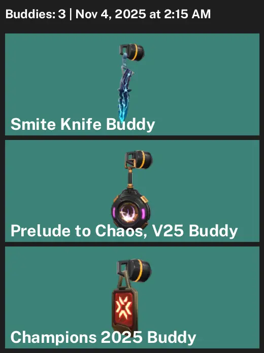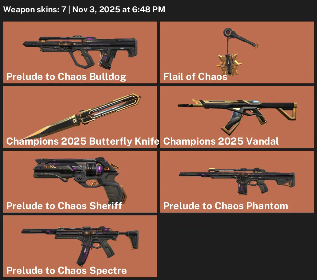 🩺 EU ⛺️ Unranked 🕶 7 Skins 🥚 2910 VP 💪 0 Agents 🦁 Value: 21075 VP ⚔️ Prelude to Chaos Bulldog 🚤 Flail of Chaos ☁️ Champions 2025 Butterfly Knife 🪞 Champions 2025 Vandal ✂️ Prelude to Chaos Sheriff 🪗 Prelude to Chaos Phantom