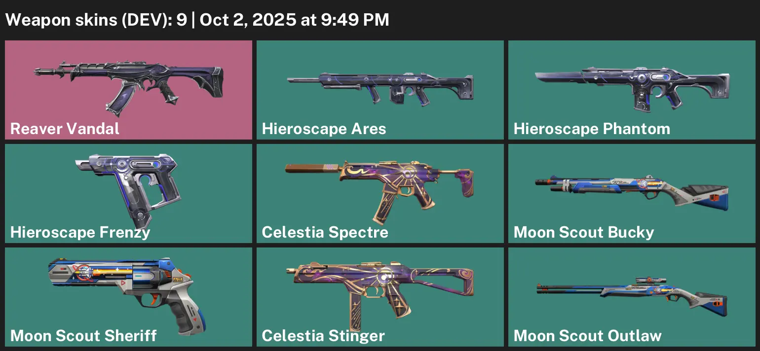 😎 EU 💩 Unranked 🎼 9 Skins 💿 275 VP 😛 3 Agents 🫙 Value: 1775 VP 🌤 Reaver Vandal 🐁 Hieroscape Ares 🧧 Hieroscape Phantom 🔍 Hieroscape Frenzy 🪛 Celestia Spectre 👔 Moon Scout Bucky