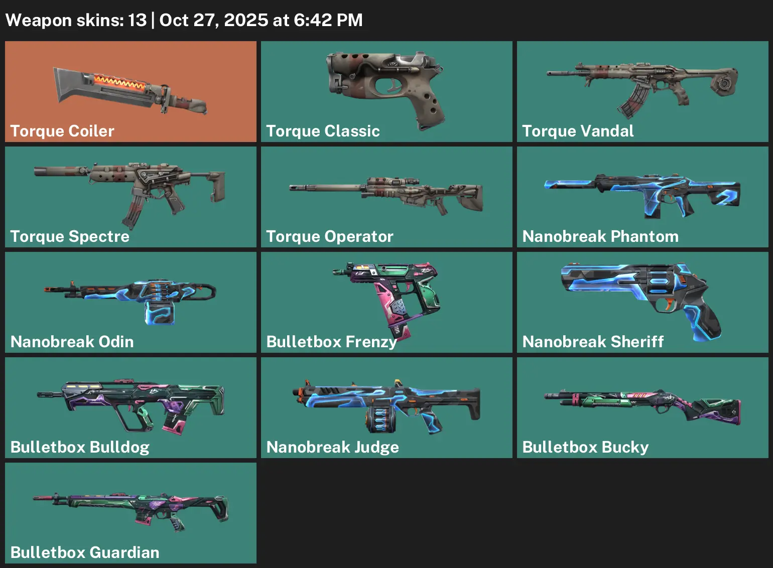 LA | 13 Skins | exp BRONZE 2 | Torque Coiler | Torque Classic | Torque Vandal | Torque Spectre | Torque Operator | Nanobreak Phantom | S4G