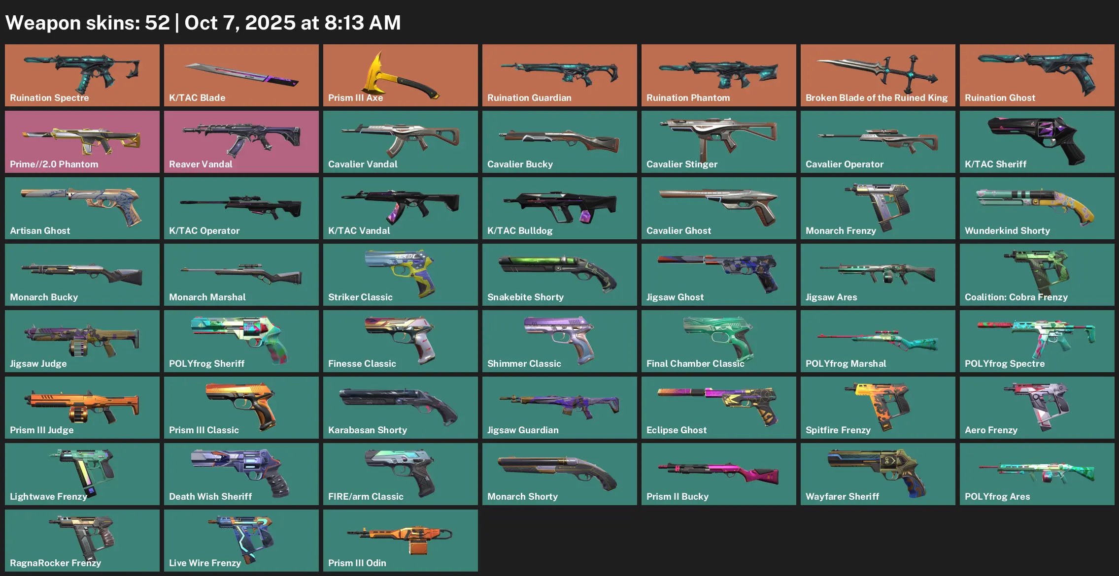 LA | 52 Skins | BRONZE 2 | Prism III Axe | K/TAC Blade | Reaver Vandal | Ruination Phantom | Prime//2.0 Phantom | #WXR6018 | #MBFN