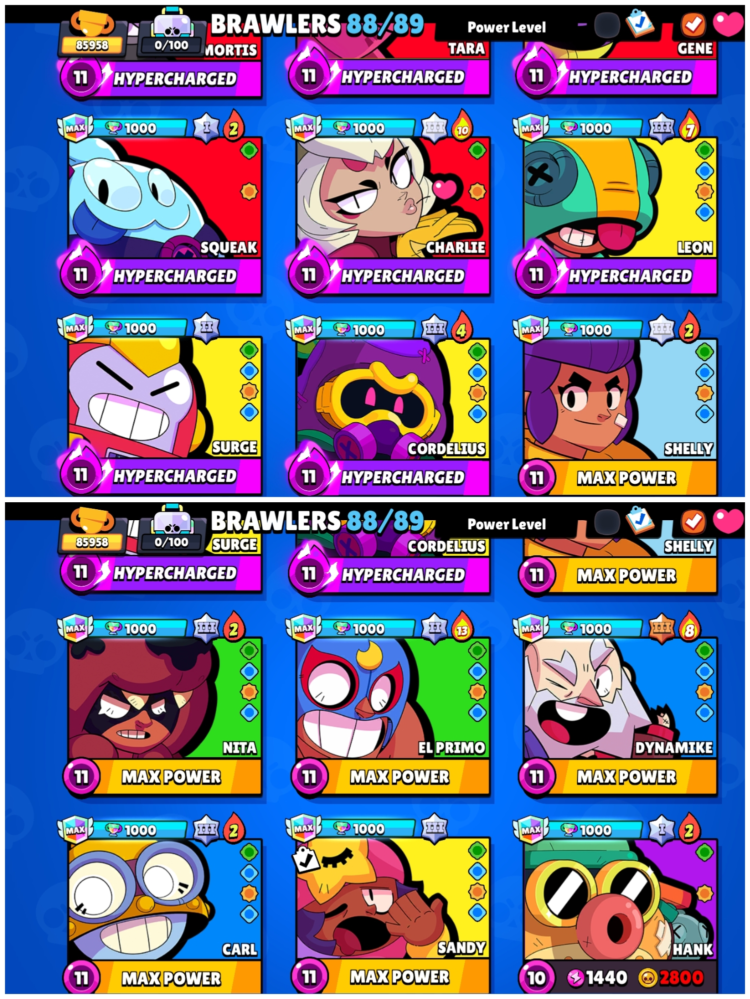 🔥86.2k Trophies 🔥🏆 XP 181 💎 88 Brawlers ⚔️ 23 Maxed Brawlers 🚀 17 Hypercharge 🧧Lunar Fame 3 🌟 148 Og Exclusive Skins 💢 Furious Fang 🥶 Frost Queen Amber ❄️ Light Mecha Bo 😈 Demon Willow 🐲 Mecha-Tick Ghidorah