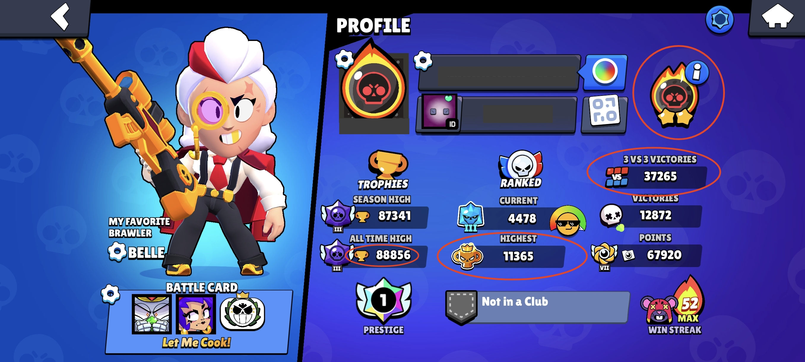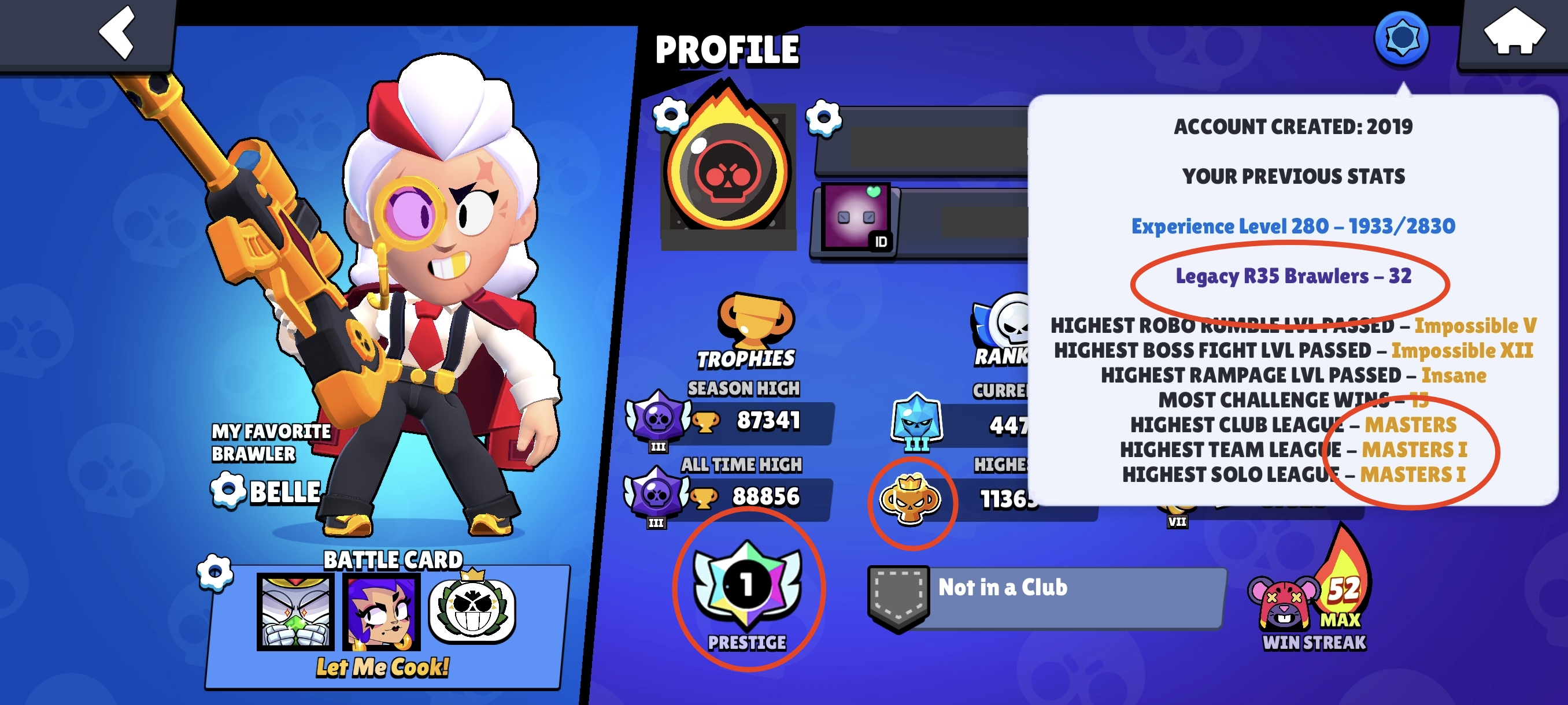 ✨ 88k Trophy ✨ Pro Rank ✨ 32x Legacy R35 ✨ Trophy Titan ✨ Masters In Solo Power League ✨ Masters in Team Power League ✨ 6x Old Masters ✨ 6x New Masters ✨ 1x Prestige ✨ Meteoric 2 Fame ✨