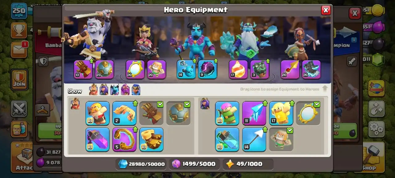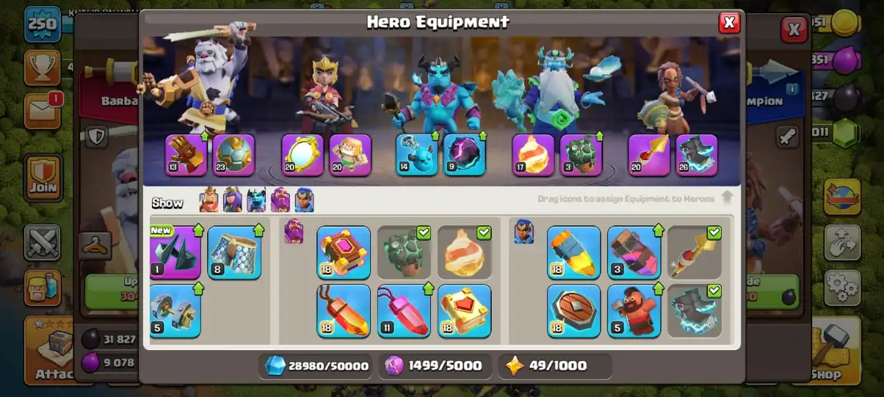 Big sale✅5 scenery and 25 heroes skin🔥TH 17 almost max🔥high heroes level 93/95/77/70/45🔥max pets☠️full equipment 31/32⚒️max builder base