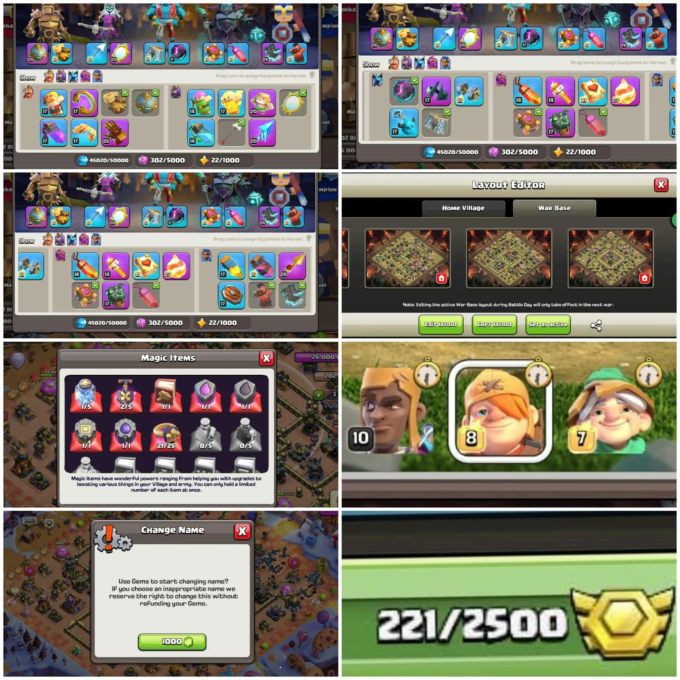 LEAGUE KING SKIN | EXP-226 TH- 17 MAX | 5 HERO | 4 EPIC MAX | HEROS 100-100-90-75-50 12 EPIC EQUIPMENT MADEL- 221 HUT MAXED NC- 1000