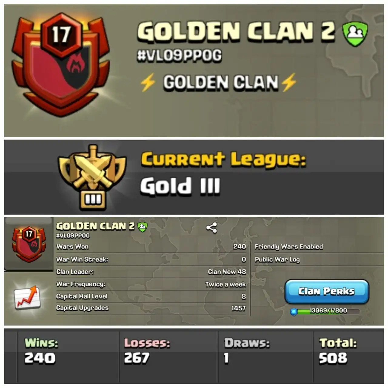 Name - GOLDEN CLAN 2 || level 17 clan || clan capital 8 || gold 3