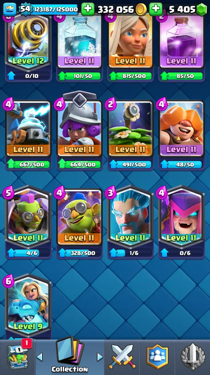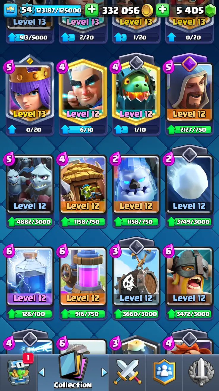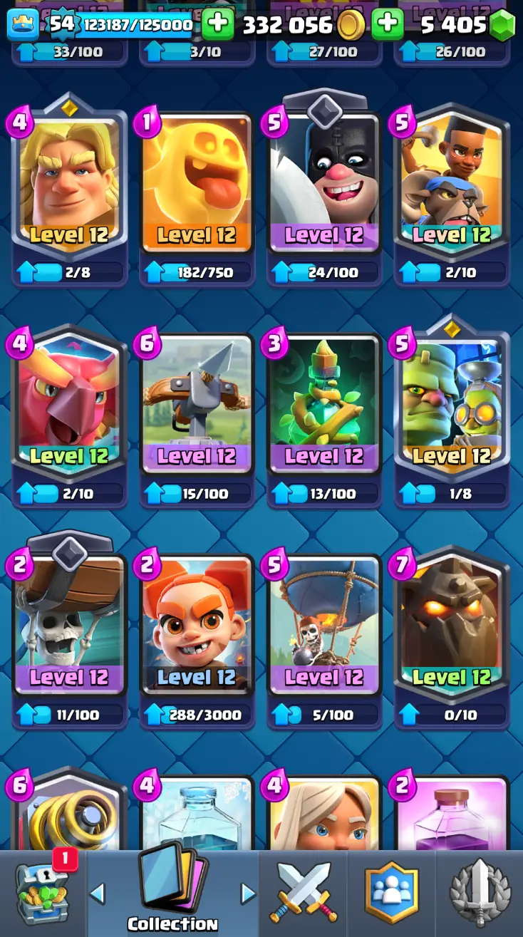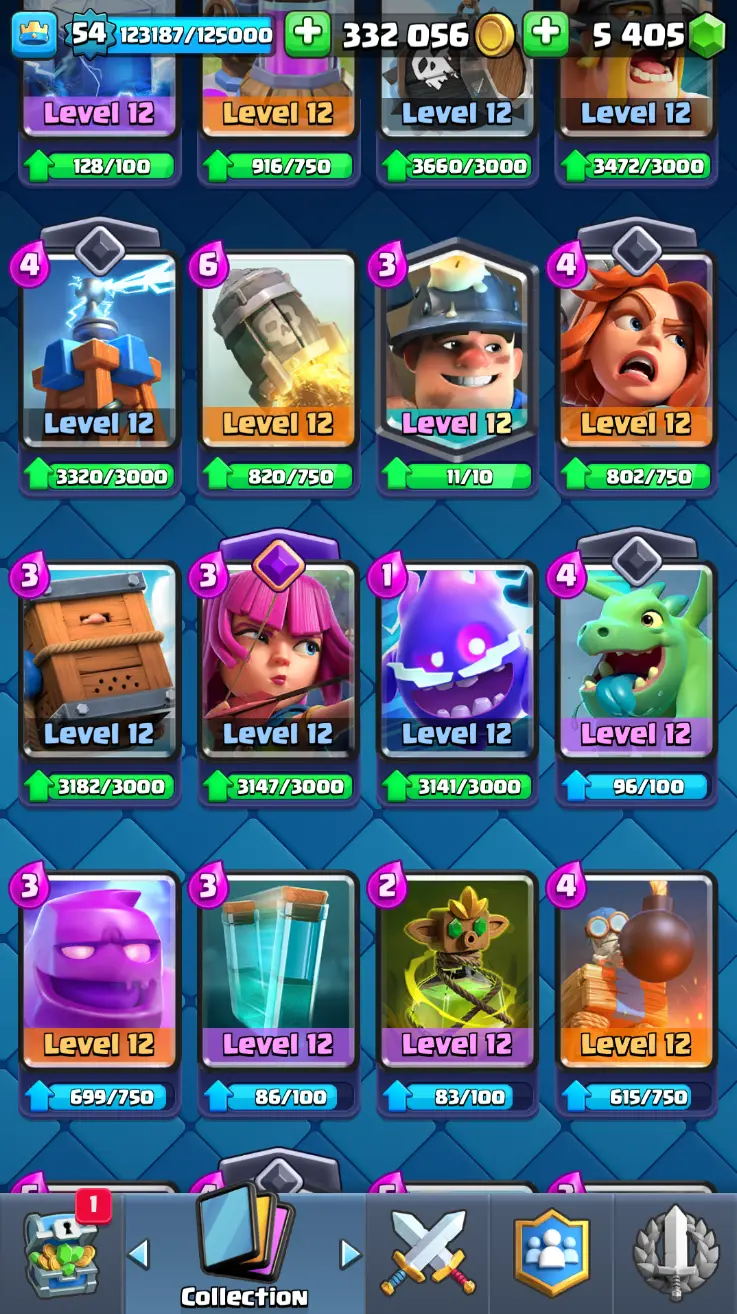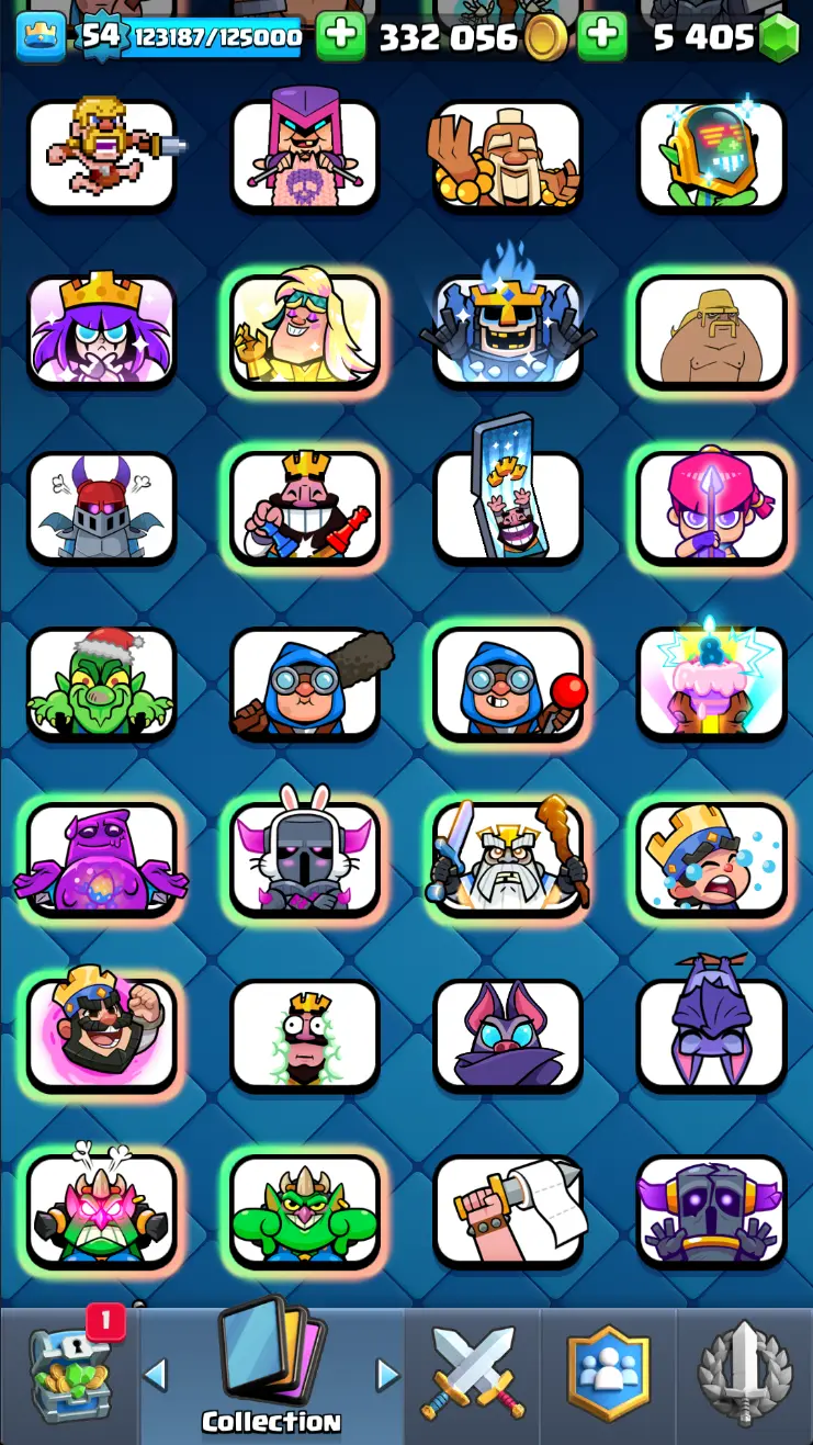 ◀️ KT 15 ▶️ LEVEL 54 🤩 12300 TROPHIES 🏆 6 ELITE CARD 🙀 25 MAX CARD 😎 14 EVO ☠️ 81 EMOTE 😍 9 SKIN 👽 121 CARDS 💳 332k GOLD 💰 5405 GEMS 💎 RL138