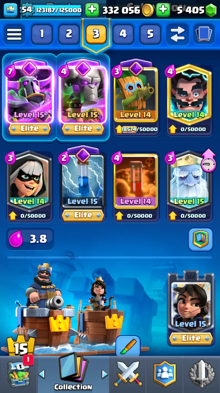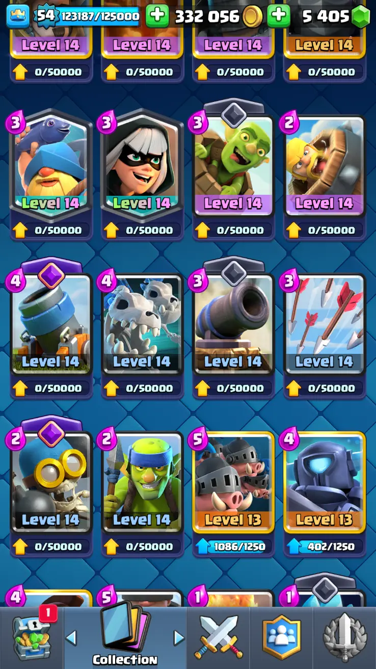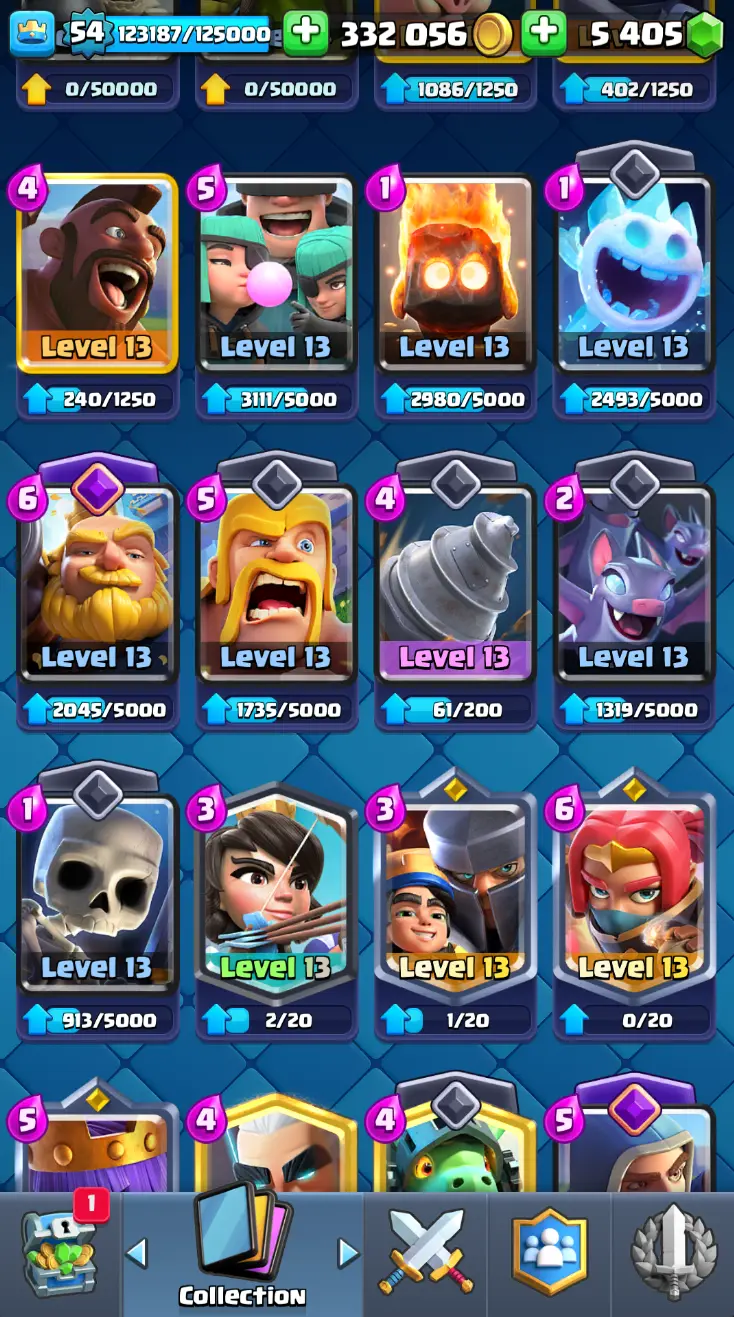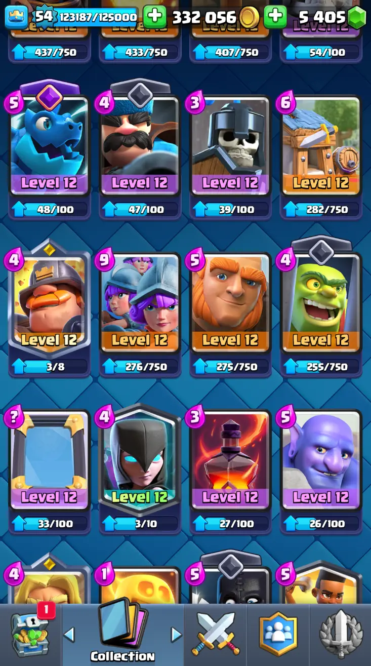 ◀️ KT 15 ▶️ LEVEL 54 🤩 12300 TROPHIES 🏆 6 ELITE CARD 🙀 25 MAX CARD 😎 14 EVO ☠️ 81 EMOTE 😍 9 SKIN 👽 121 CARDS 💳 332k GOLD 💰 5405 GEMS 💎 RL138