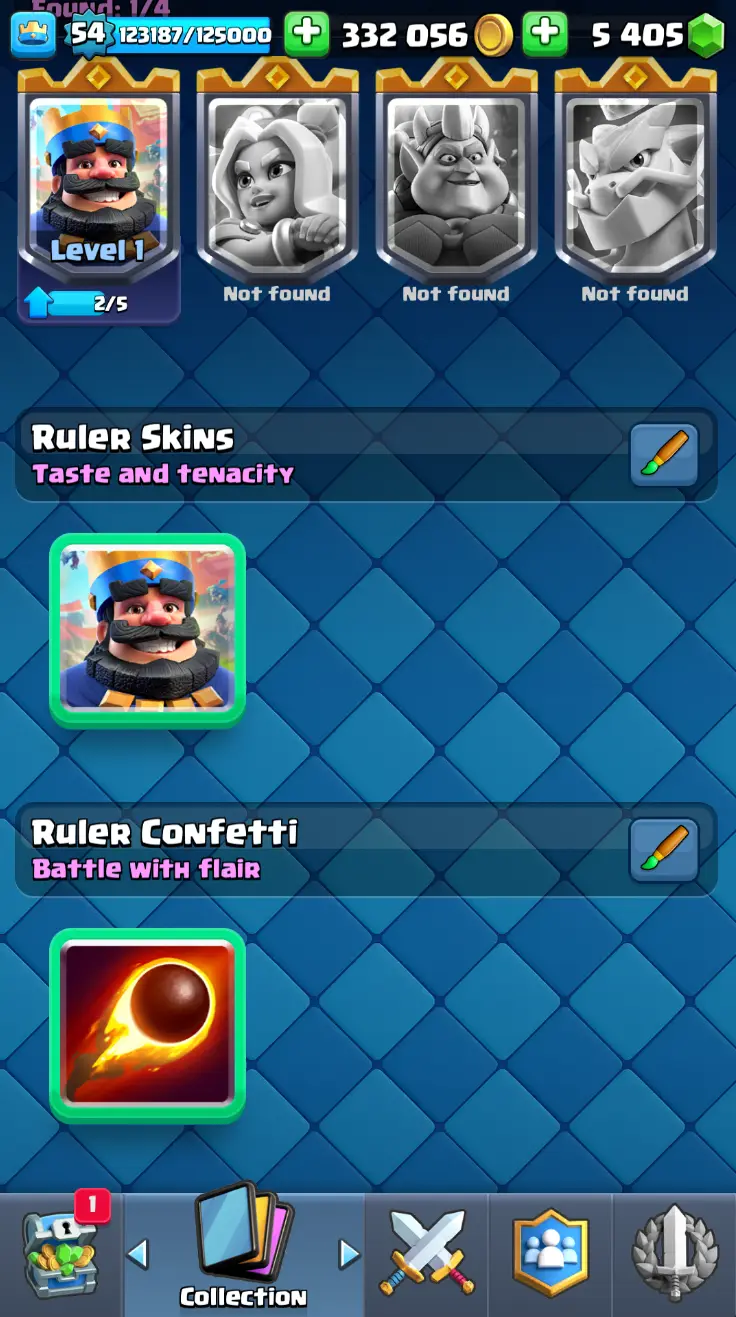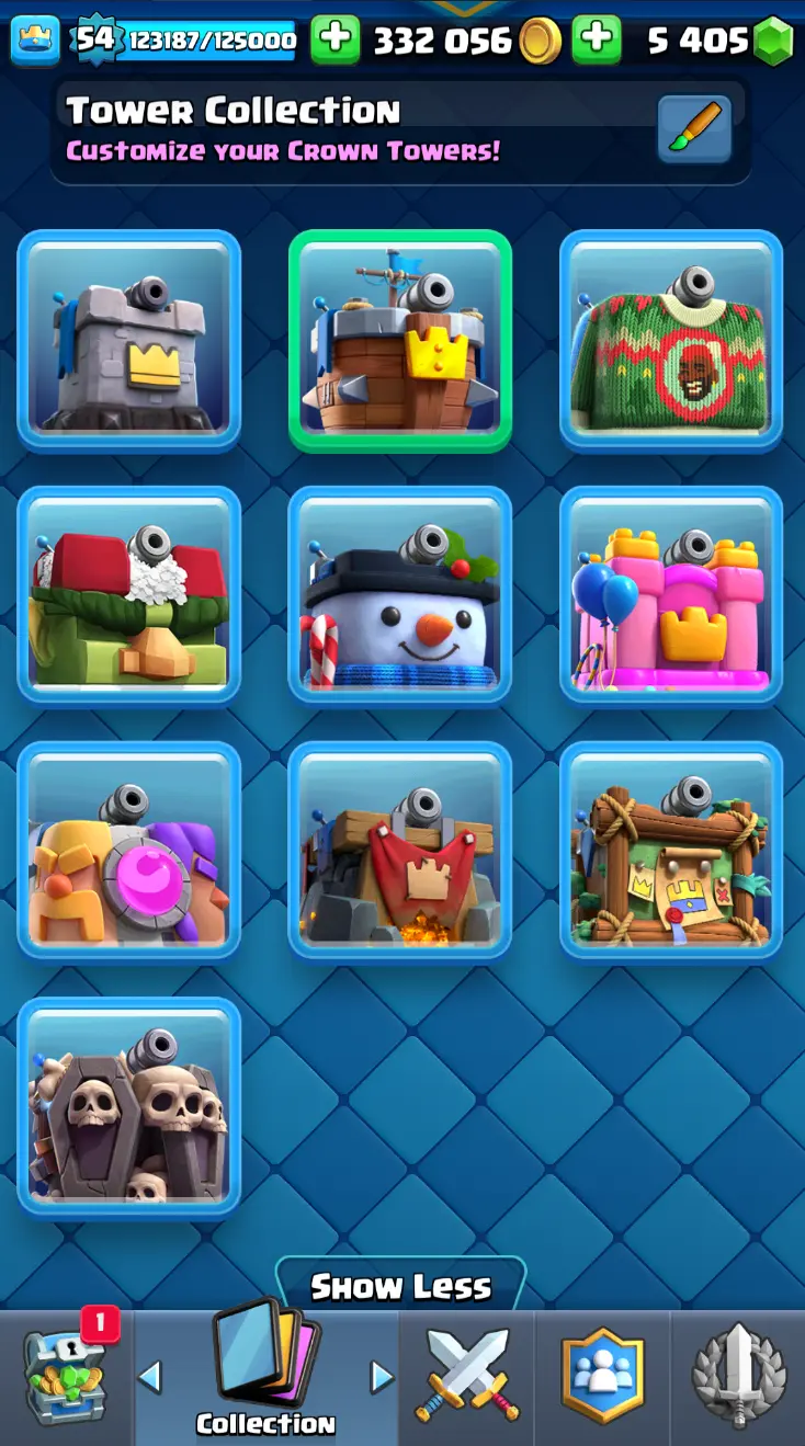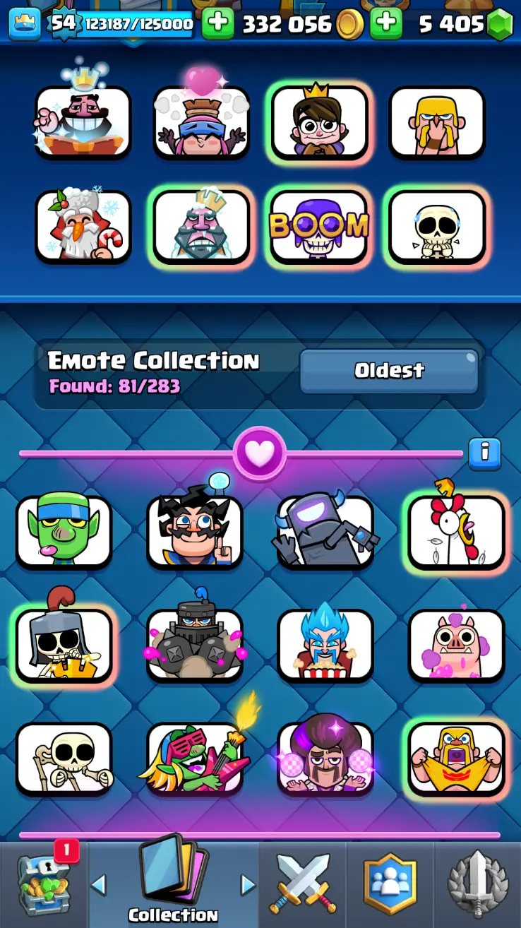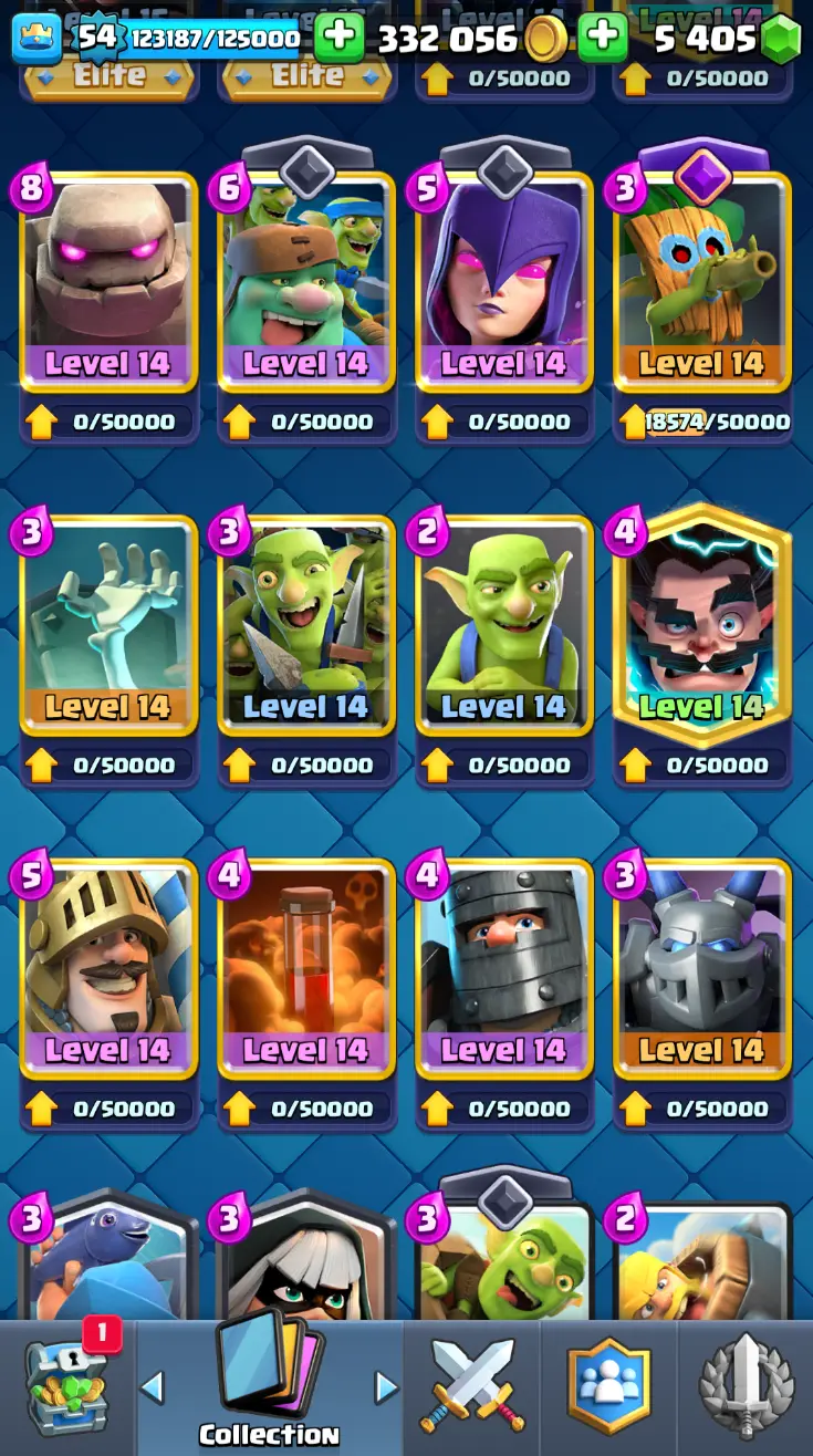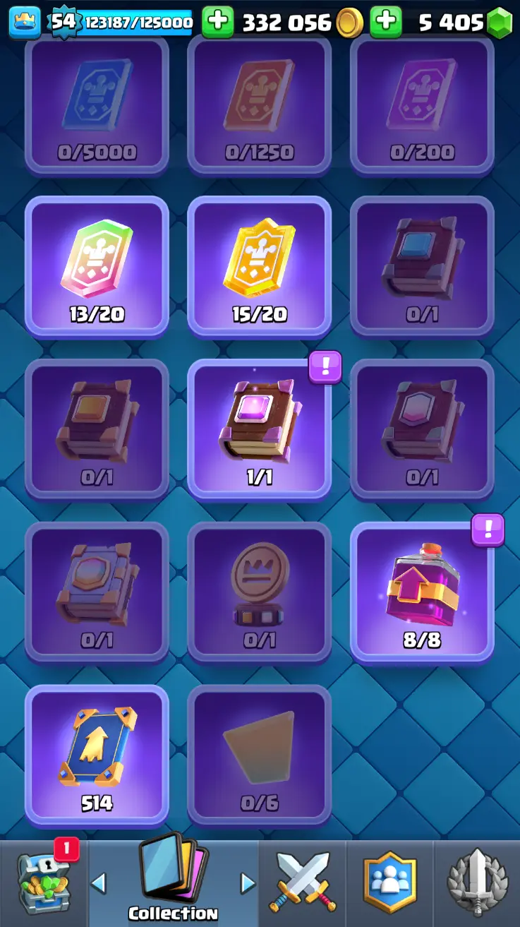 ◀️ KT 15 ▶️ LEVEL 54 🤩 12300 TROPHIES 🏆 6 ELITE CARD 🙀 25 MAX CARD 😎 14 EVO ☠️ 81 EMOTE 😍 9 SKIN 👽 121 CARDS 💳 332k GOLD 💰 5405 GEMS 💎 RL138