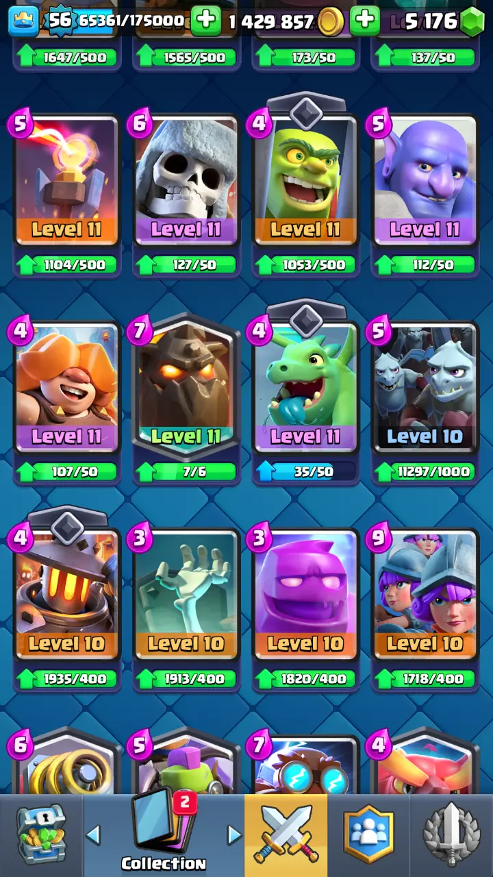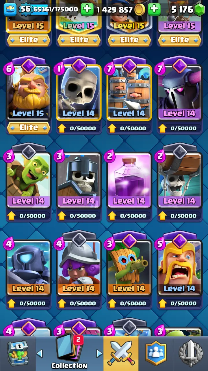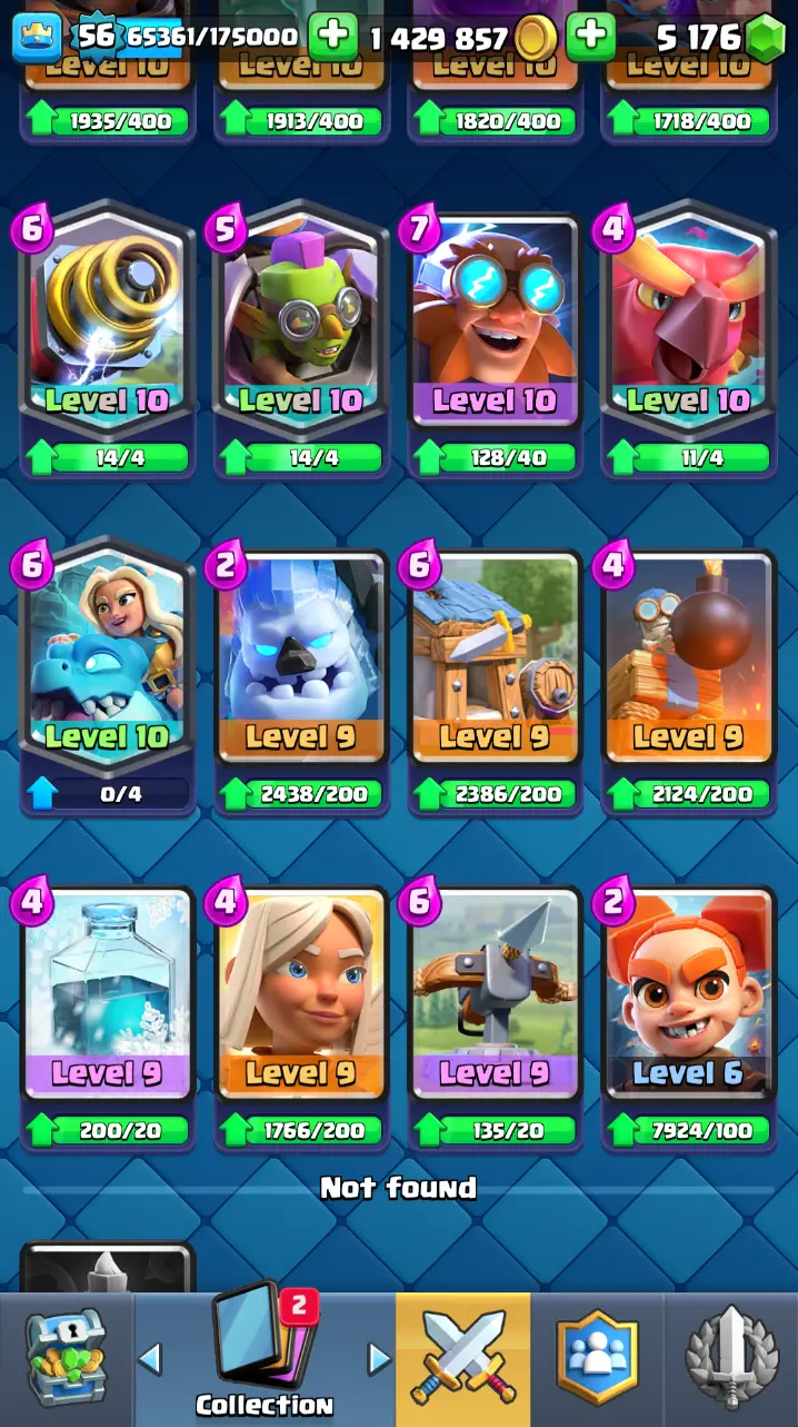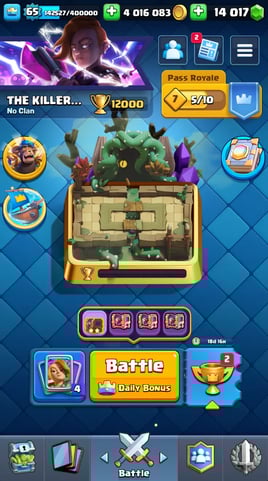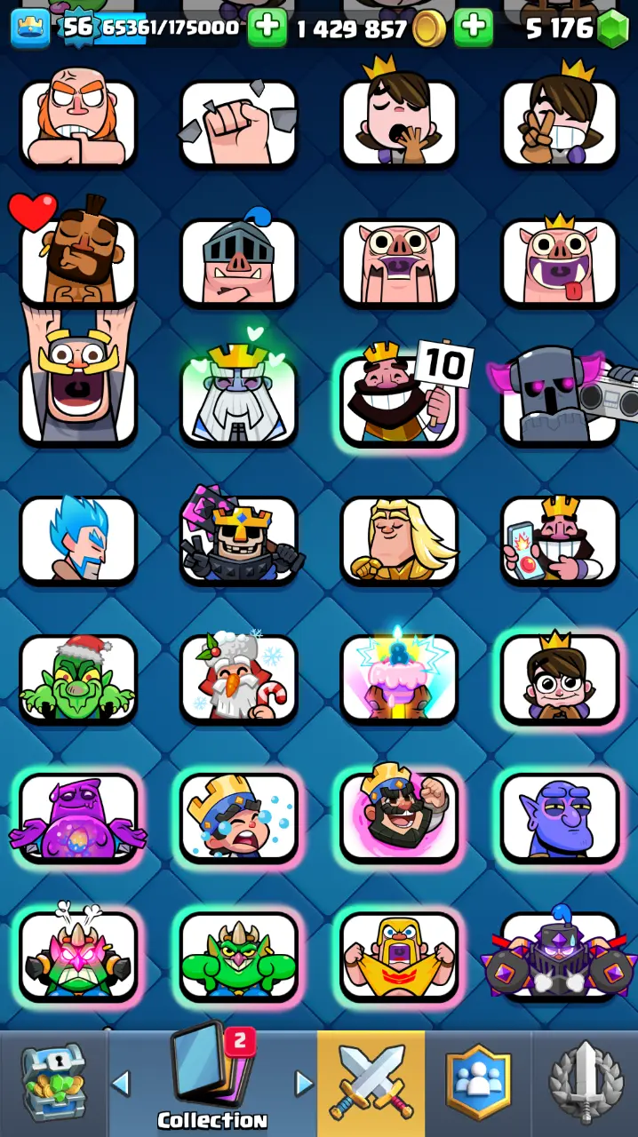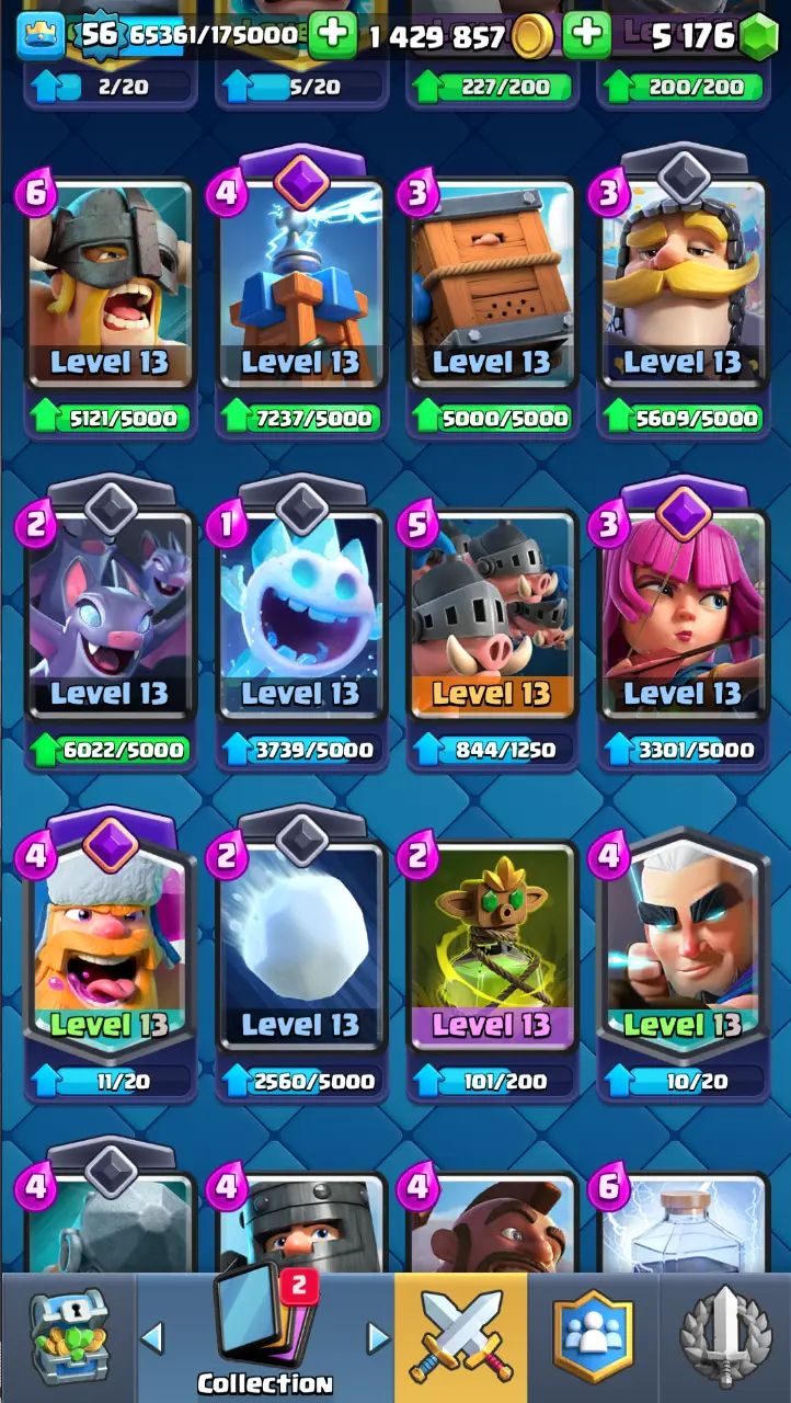 ◀️ KT 15 ▶️ LEVEL 56 🤩 9629 TROPHIES 🏆 9 ELITE CARD 🙀 19 MAX CARD 😎 16 EVO ☠️ 66 EMOTE 😍 5 SKIN 👽 120 CARDS 💳 1.4m GOLD 💰 5176 GEMS 💎 RL102