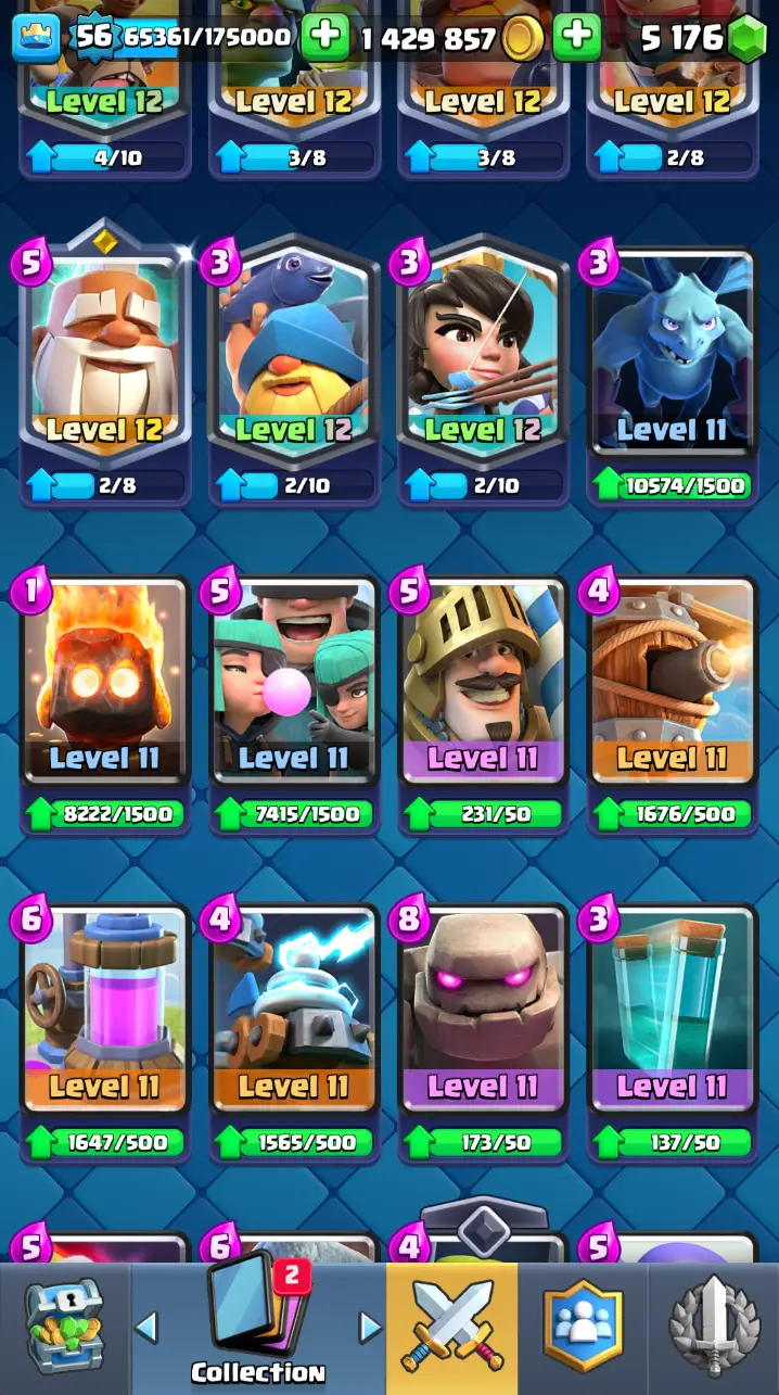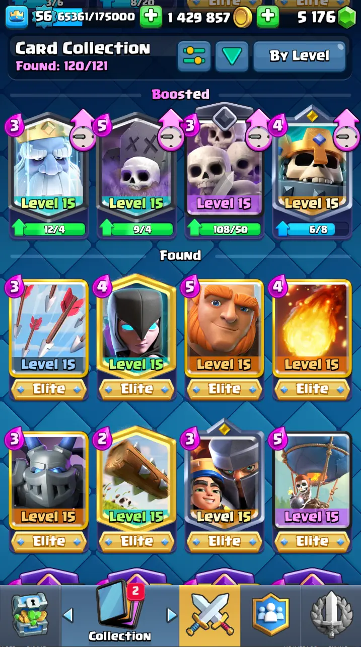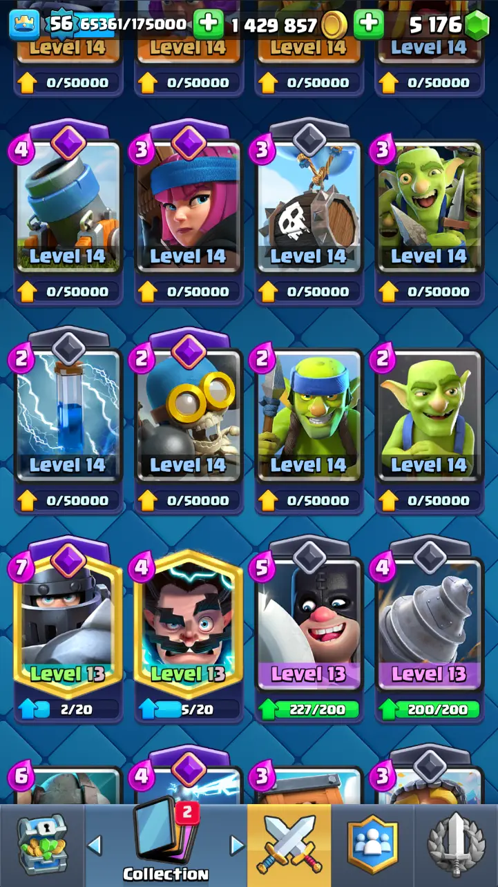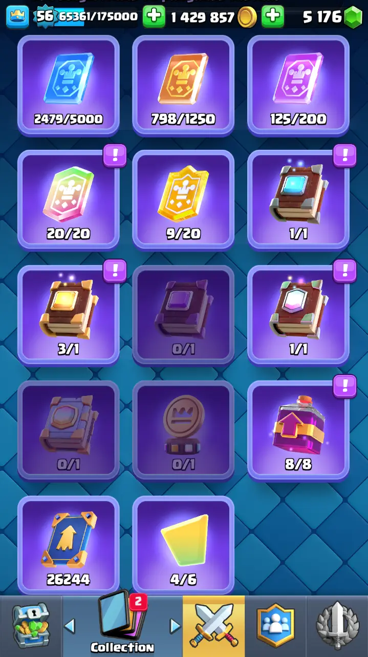 ◀️ KT 15 ▶️ LEVEL 56 🤩 9629 TROPHIES 🏆 9 ELITE CARD 🙀 19 MAX CARD 😎 16 EVO ☠️ 66 EMOTE 😍 5 SKIN 👽 120 CARDS 💳 1.4m GOLD 💰 5176 GEMS 💎 RL102