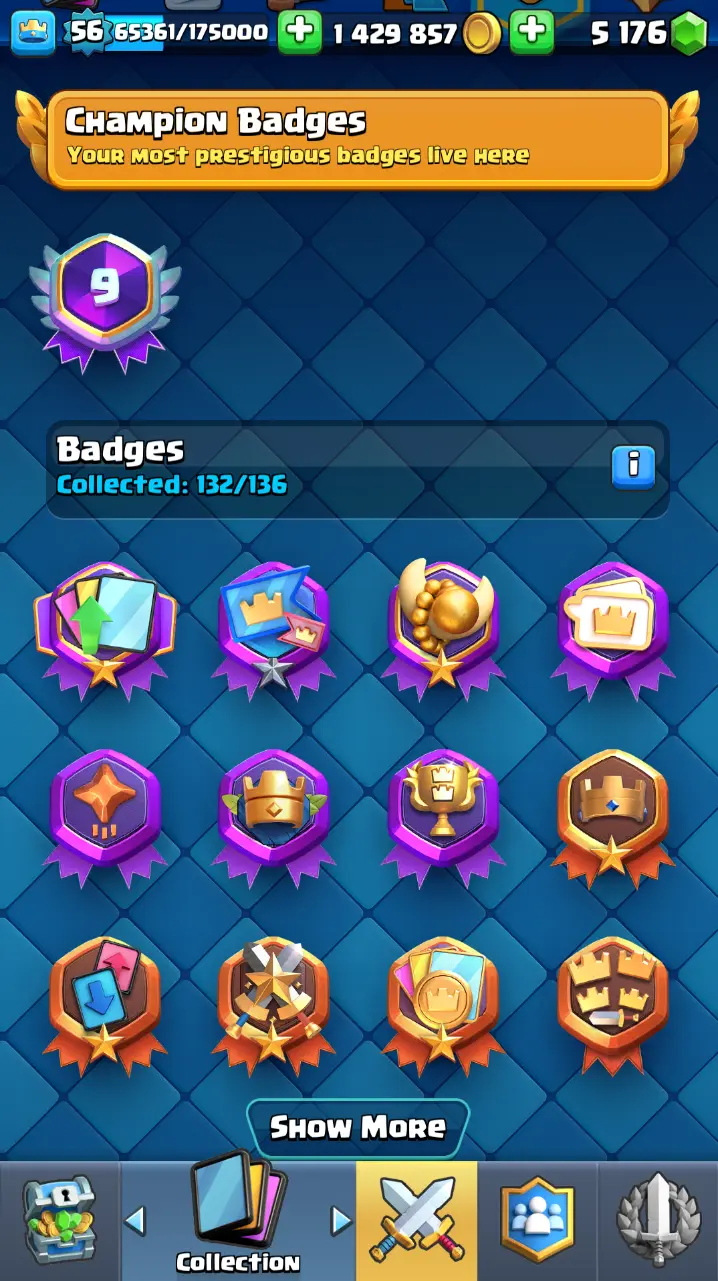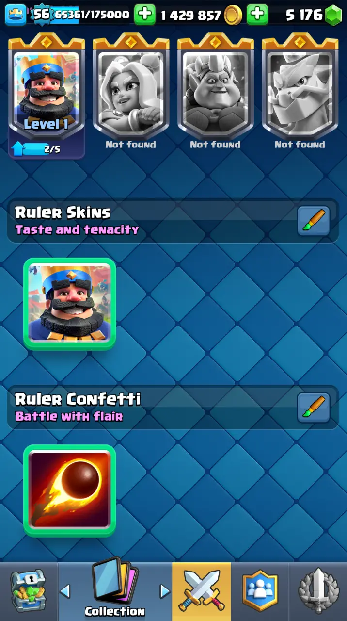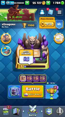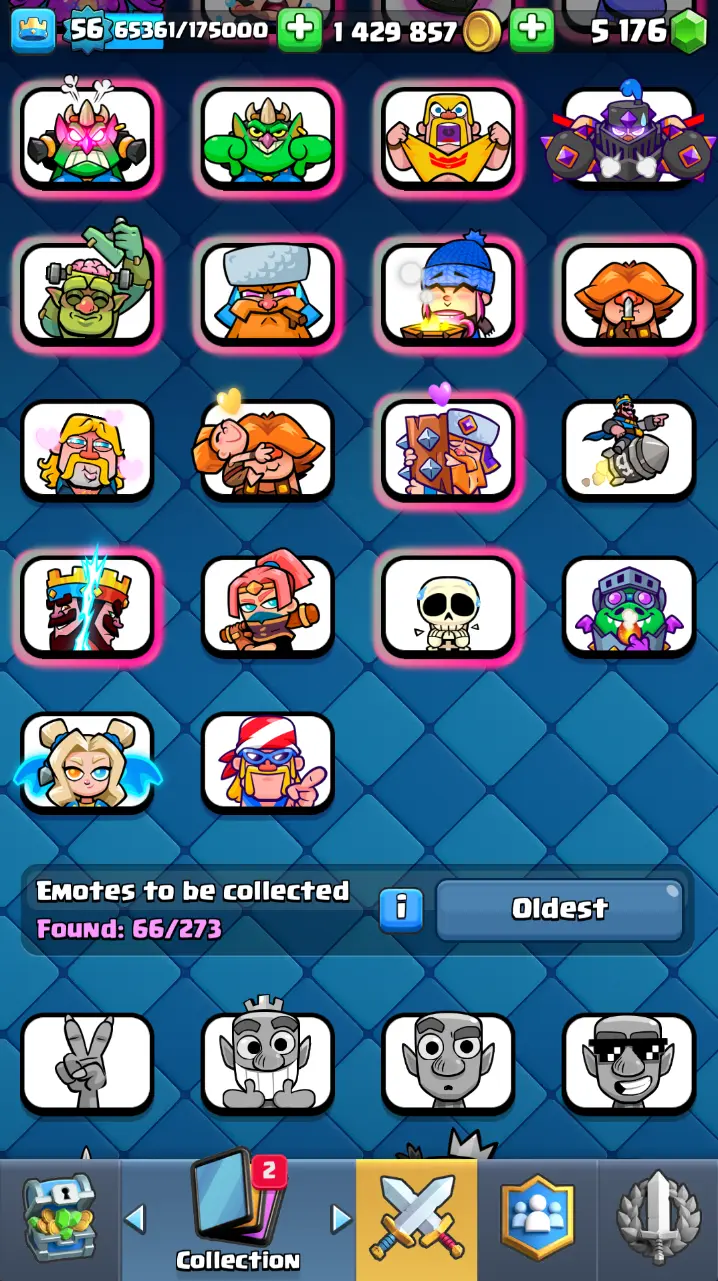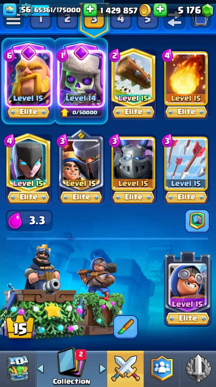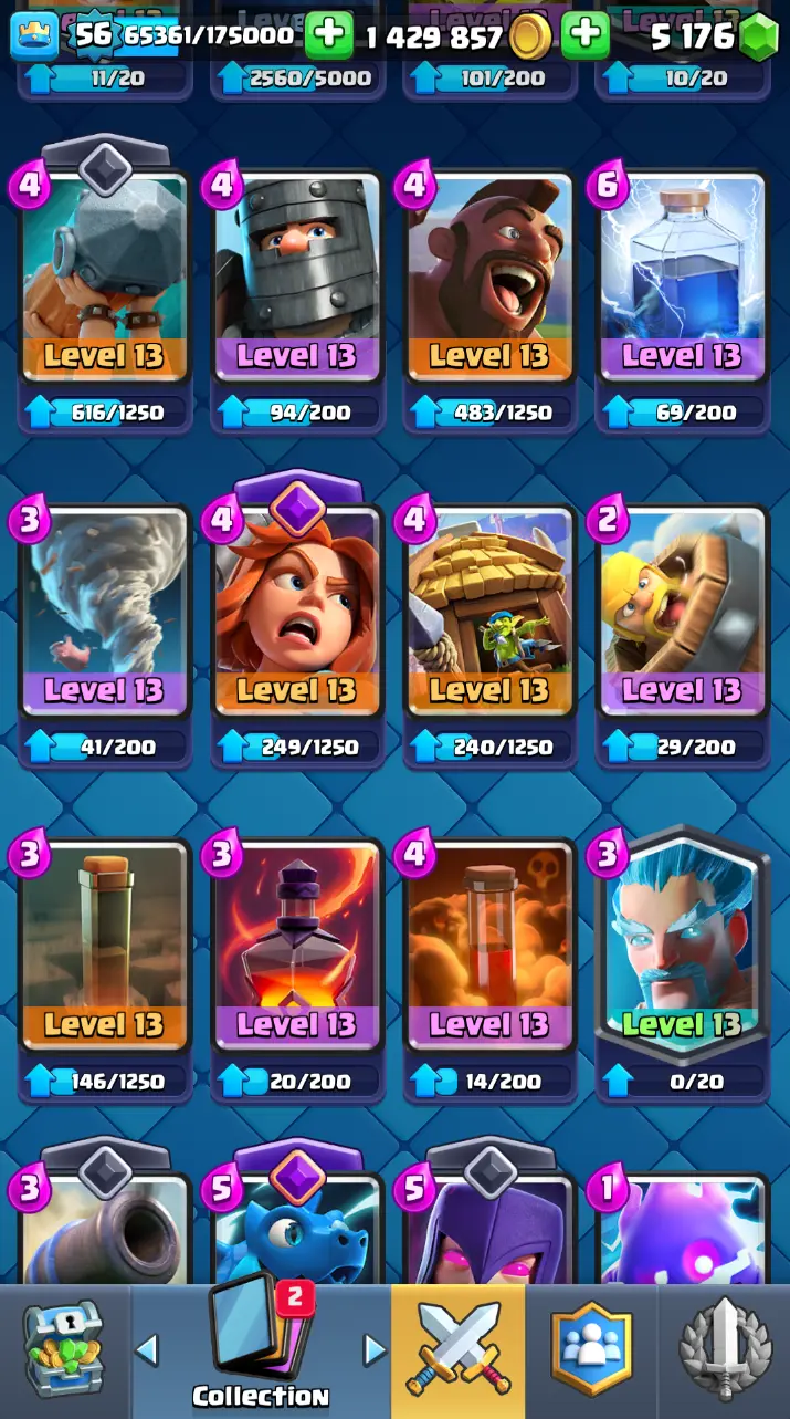◀️ KT 15 ▶️ LEVEL 56 🤩 9629 TROPHIES 🏆 9 ELITE CARD 🙀 19 MAX CARD 😎 16 EVO ☠️ 66 EMOTE 😍 5 SKIN 👽 120 CARDS 💳 1.4m GOLD 💰 5176 GEMS 💎 RL102